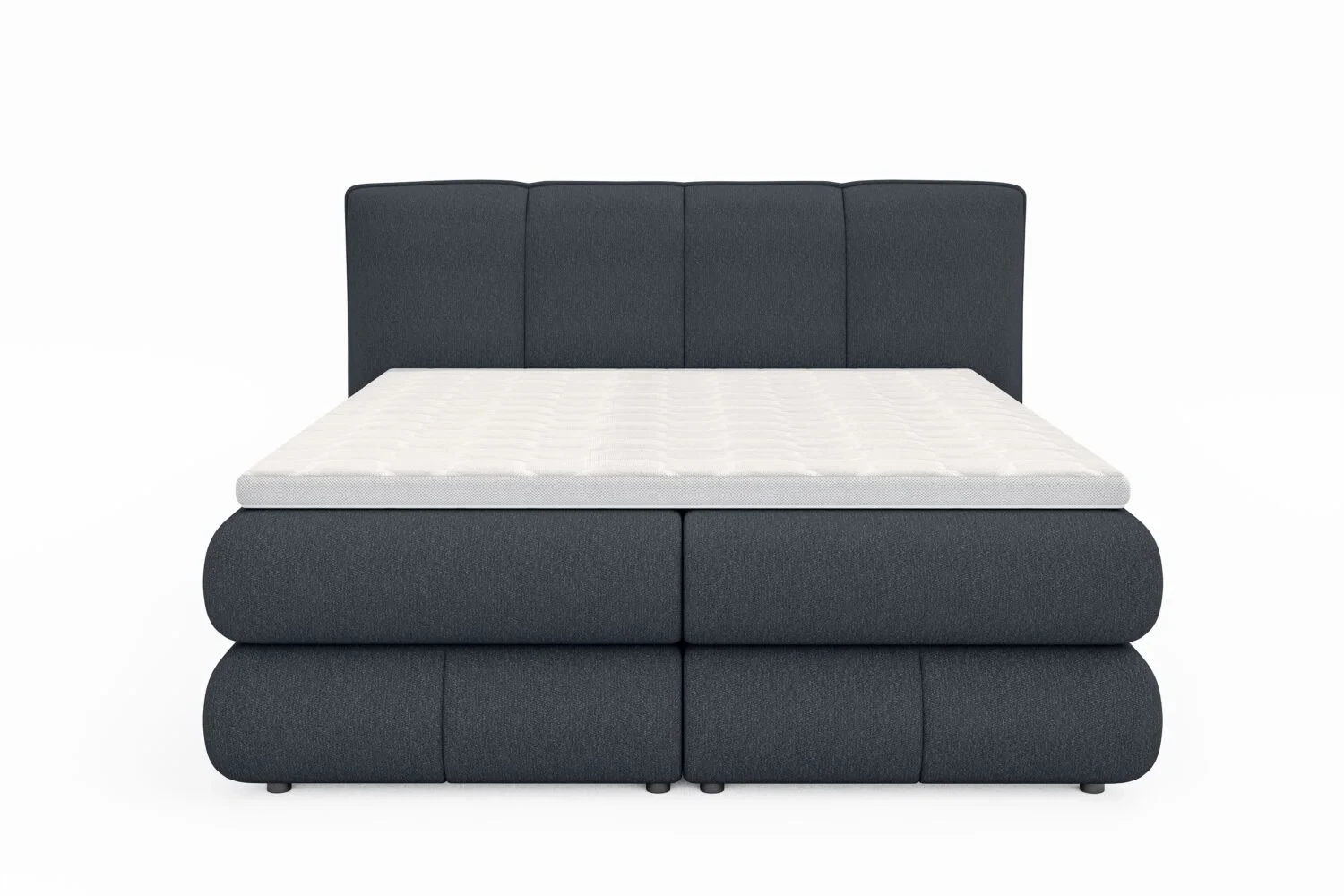 Postel stojí na stabilní boxspring základně se skrytými nožkami, které nenarušují její elegantní vzhled.