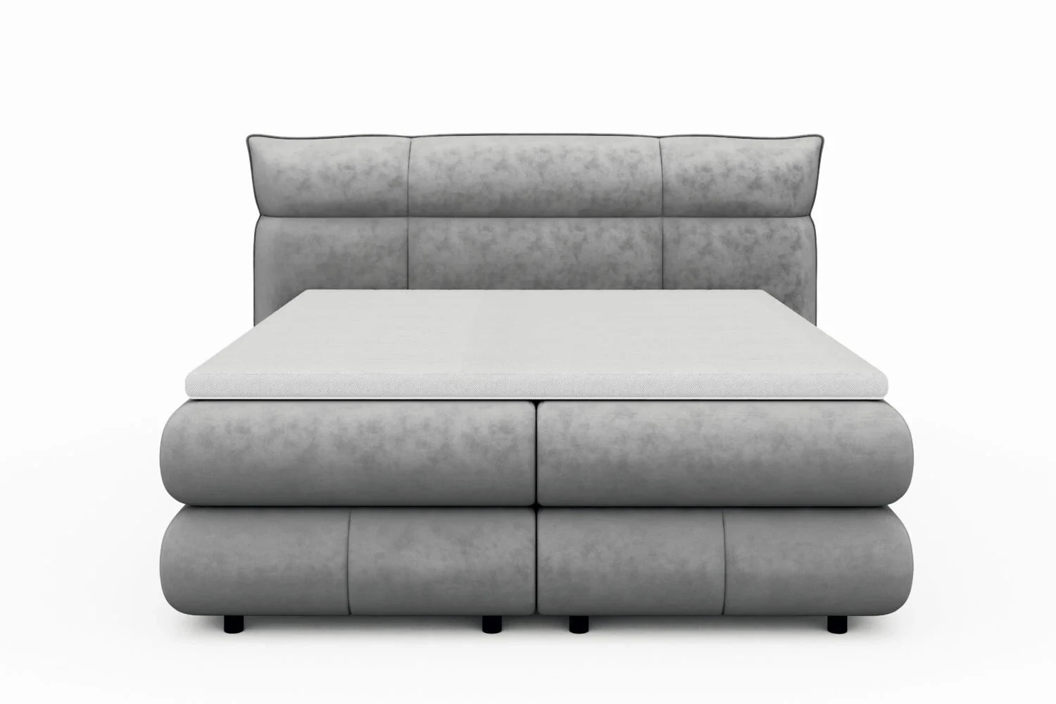 Postel stojí na stabilní boxspring základně se skrytými nožkami, které nenarušují její elegantní vzhled.