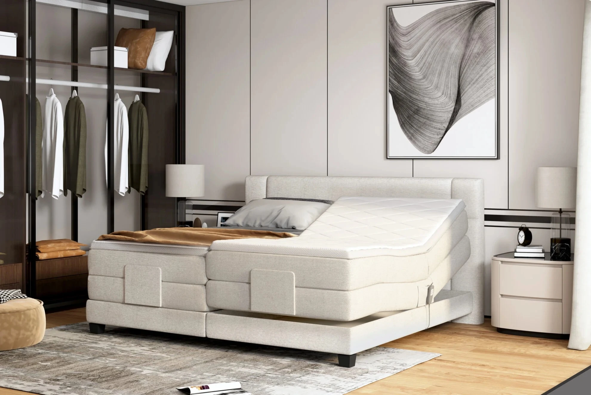 Už na první pohled zaujme elegantním čelem s precizním prošíváním, které dodává celé posteli luxusní charakter. Skutečný zážitek ale přichází ve chvíli, kdy si lehnete. Díky elektrickému polohování si můžete každou stranu postele nastavit přesně tak, jak vám to vyhovuje – ať už relaxujete, čtete knihu nebo sledujete televizi.
