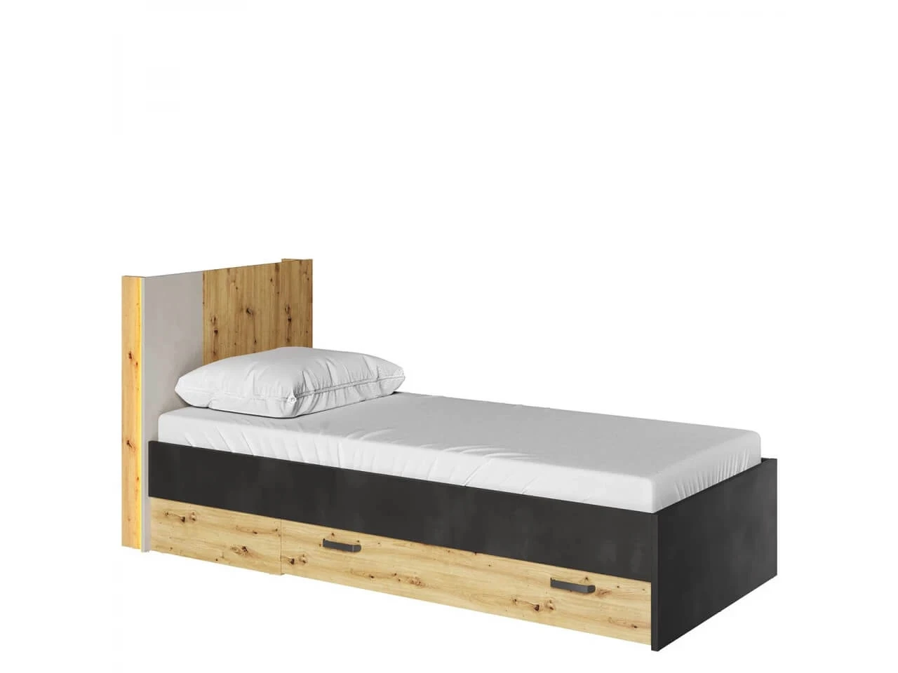 Postel je vyrobena z laminované dřevotřískové desky s ABS hranami. Kovové úchyty a kluzáky nožek zajišťují stabilitu a snadné přesouvání nábytku. Při používání úložného prostoru na ložní prádlo můžete zvolit montáž na levou nebo pravou stranu, přičemž dno zásuvky je vyrobeno z HDF desky o tloušťce 3 mm. Součástí ceny je lamelový rošt, zatímco matrace o rozměrech 90 x 200 cm není součástí setu, ale lze ji dokoupit. Pro zvýšení pohodlí a atmosféry je součástí postele i LED osvětlení.