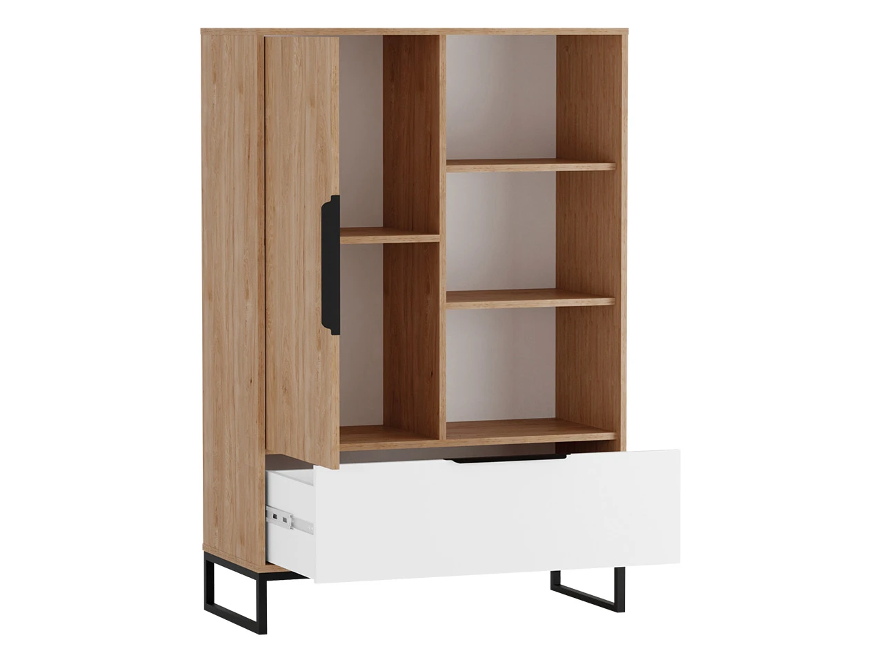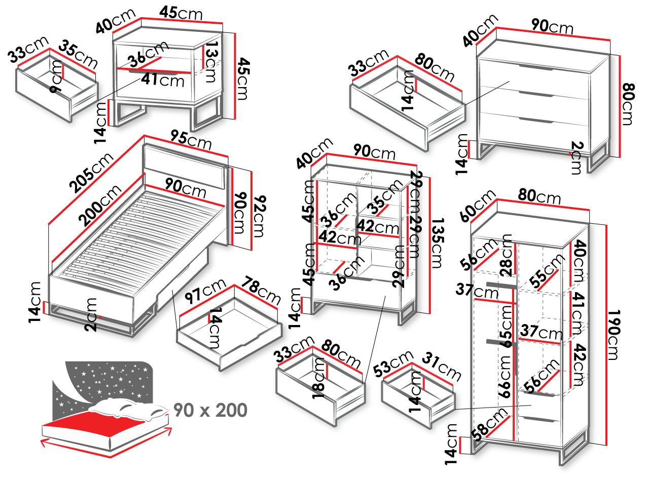 Přední část a korpus nábytku jsou vyrobeny z laminované desky v dekoru Hickory, což zajišťuje pevnost a odolnost. Okraje jsou chráněny materiálem ABS na viditelných plochách a papírem na neviditelných plochách, což zvyšuje trvanlivost a estetiku. Zadní stěna je vyrobena z HDF desky o tloušťce 3 mm, která poskytuje potřebnou stabilitu. Rám nábytku je kovový a práškově lakovaný na černou barvu, což dodává moderní vzhled a zajišťuje dlouhou životnost. Úchyty jsou kovové, což usnadňuje manipulaci s nábytkem. Kuličkové kolejnice zajišťují hladký a tichý pohyb zásuvek, zatímco skryté panty (puskové) přispívají k elegantnímu designu. Uvnitř skříně se nacházejí police a dva drážky na oblečení, které poskytují dostatek prostoru pro uložení věcí. Postel je vyrobena také z laminované desky, což zajišťuje její pevnost. Hlavová část postele je vyrobena z pěny T25 o tloušťce 2 cm a je částečně čalouněná, což poskytuje pohodlí a estetiku. Úložný prostor na ložní prádlo lze namontovat na levou nebo pravou stranu a má dno vyrobené z HDF desky o tloušťce 3 mm. Výřez na přední části zásuvky slouží jako úchyt pro snadné otevírání. Zásuvka se otevírá pomocí koleček na dně, což zajišťuje hladký pohyb. Lamelový rošt je součástí ceny postele. Matrace o rozměrech (90 x 200 cm) není součástí sady, ale lze ji dokoupit podle aktuální nabídky.