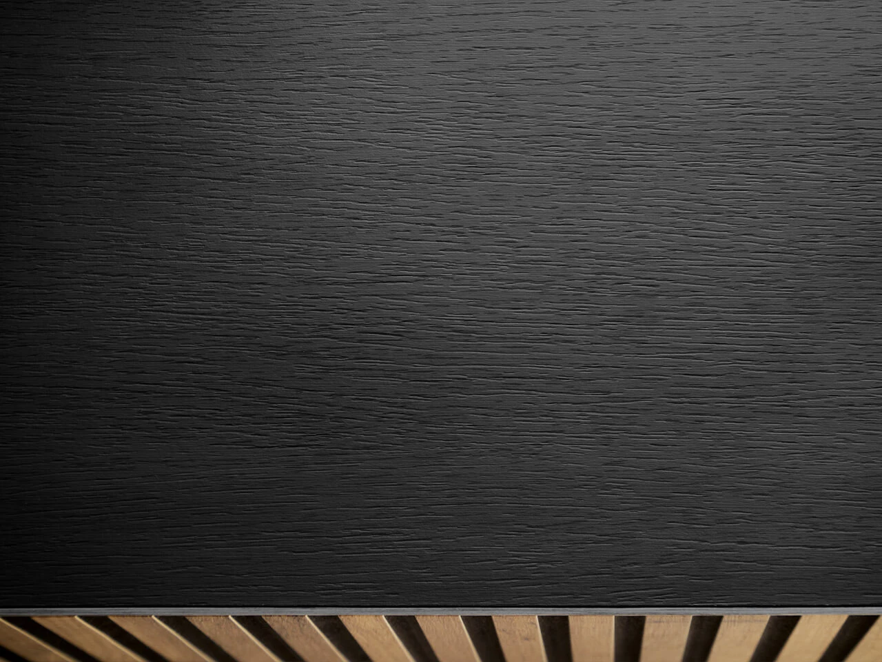 Laminovaný korpus (16 mm) zajišťuje pevnou konstrukci a dlouhou životnost. Čela z MDF desky (18 mm) s hliníkovým rámem a tvrzeným sklem působí luxusně a odolně zároveň. Dekorační podélné pruhy dodávají na jedinečnosti a eleganci. Ocelový rám s černým práškovým lakem zaručuje stabilitu a podtrhuje industriální nádech. Systém PUSH TO OPEN umožňuje bezúchytkové otevírání pro maximální čistotu designu. Panty HAFELE garantují tichý a plynulý chod. LED osvětlení v ceně zvýrazňuje prosklenou část komody a dodává atmosféru.