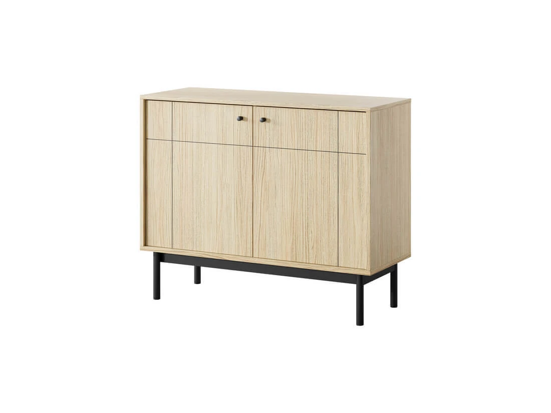 Korpus a čela jsou vyrobeny z laminované desky potažené ABS fólií, která chrání povrch proti poškrábání a vlhkosti a zároveň usnadňuje údržbu. Dřevěné nohy lakované na černo zajišťují stabilitu a dodávají nábytku lehkost. Kovové úchyty v minimalistickém stylu podporují jednoduchý a funkční vzhled. Komoda je navíc vybavena systémem tichého zavírání, který zajišťuje pohodlné a bezhlučné používání. Skvělá volba pro všechny, kdo hledají praktický a elegantní úložný prostor s důrazem na detail.