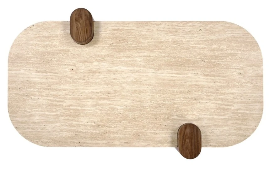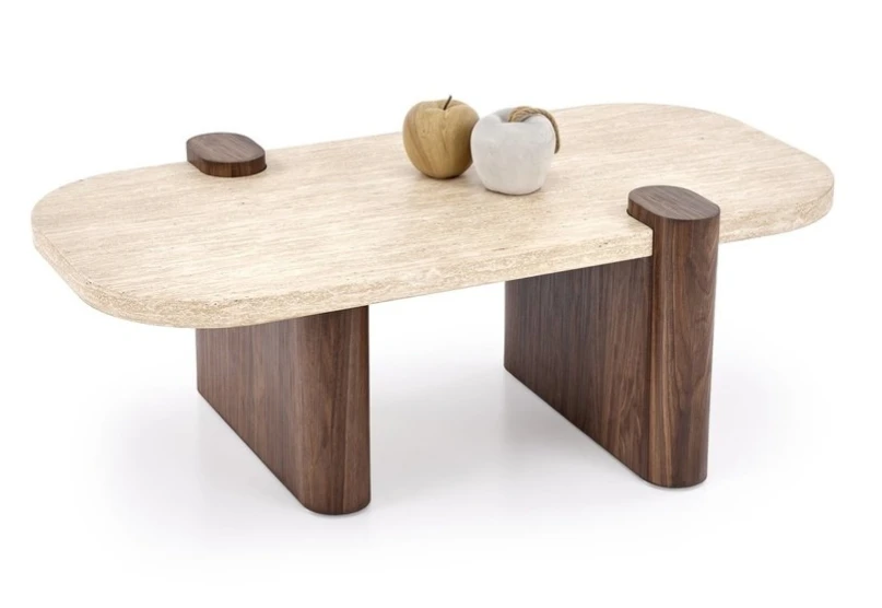 Deska z MDF s povrchovou úpravou (dekor travertinu) v kombinaci s podnoží v odstínu dřeva vytváří vizuálně vyvážený celek, který působí přirozeně a nadčasově. Výhodou jsou také zaoblené hrany (bezpečné provedení), které zvyšují komfort při každodenním používání a přispívají k plynulému začlenění do prostoru.