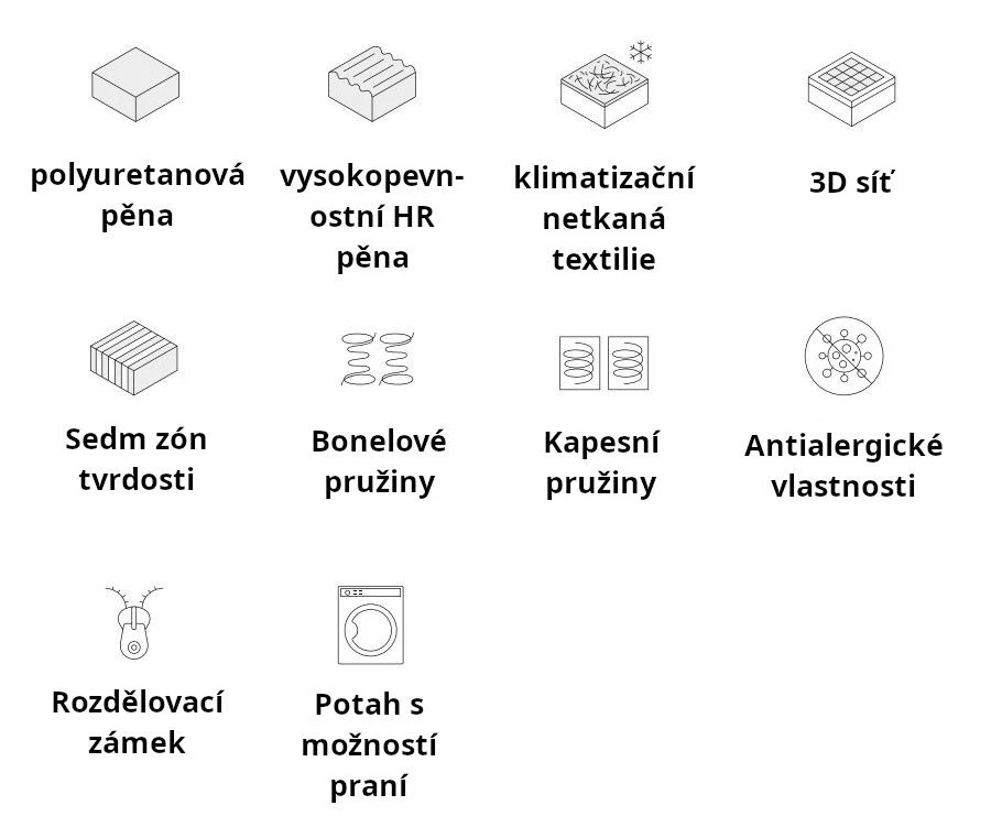 - Pružinové jádro tvoří 7 komfortních zón s rozdílnou úrovní tuhosti, to matraci umožňuje individuální přizpůsobení se každé části těla.