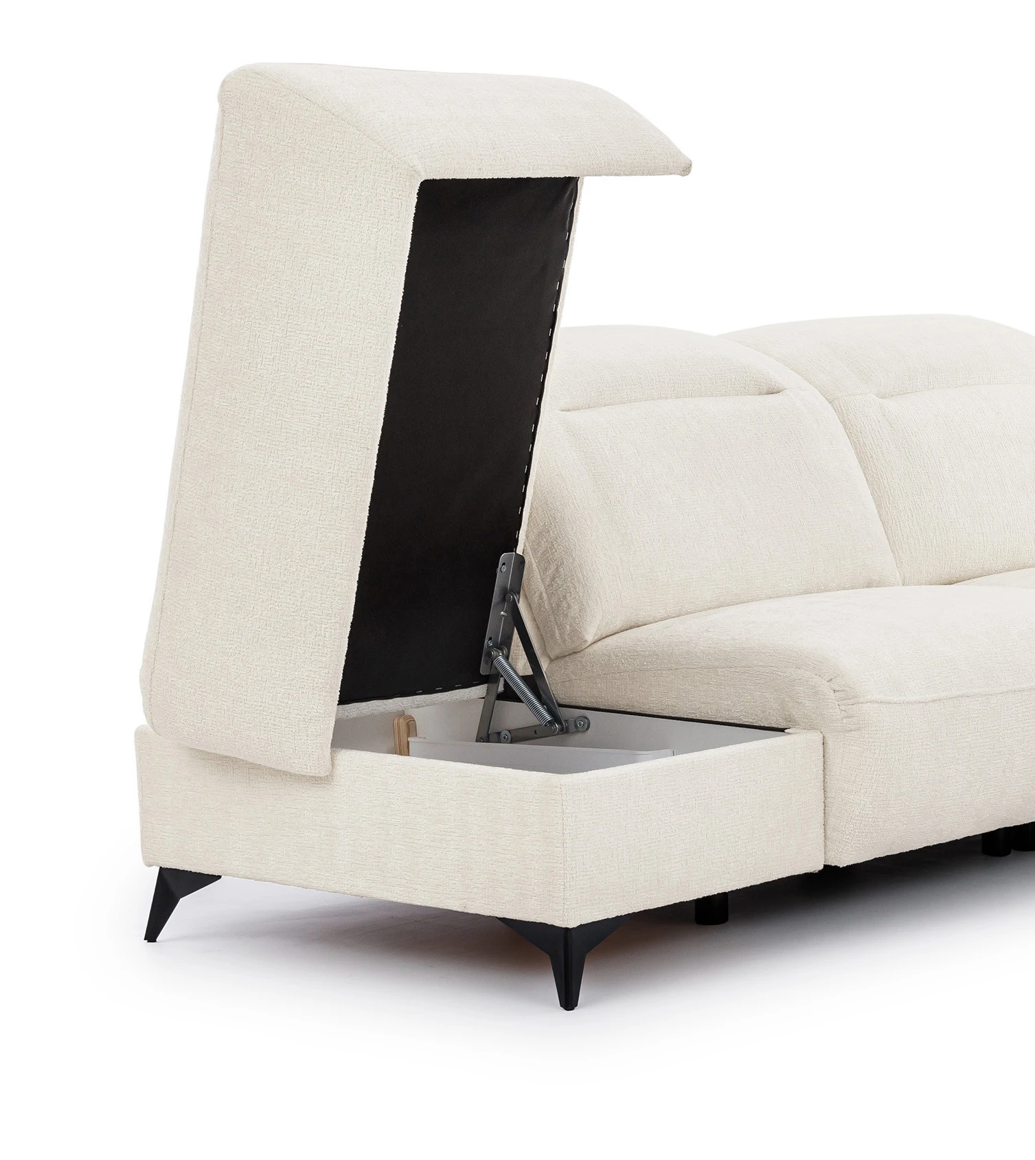 Volitelné kovové nožky sedačky zaručují pevnost a dlouhou životnost celé sedací soupravy. Pro ještě větší pohodlí jsou opěrky hlavy polohovatelné, což umožňuje přizpůsobení podpory podle vašich potřeb. Praktický úložný prostor nabízí dostatek místa pro uložení různých předmětů a udržení pořádku v obývacím pokoji.
