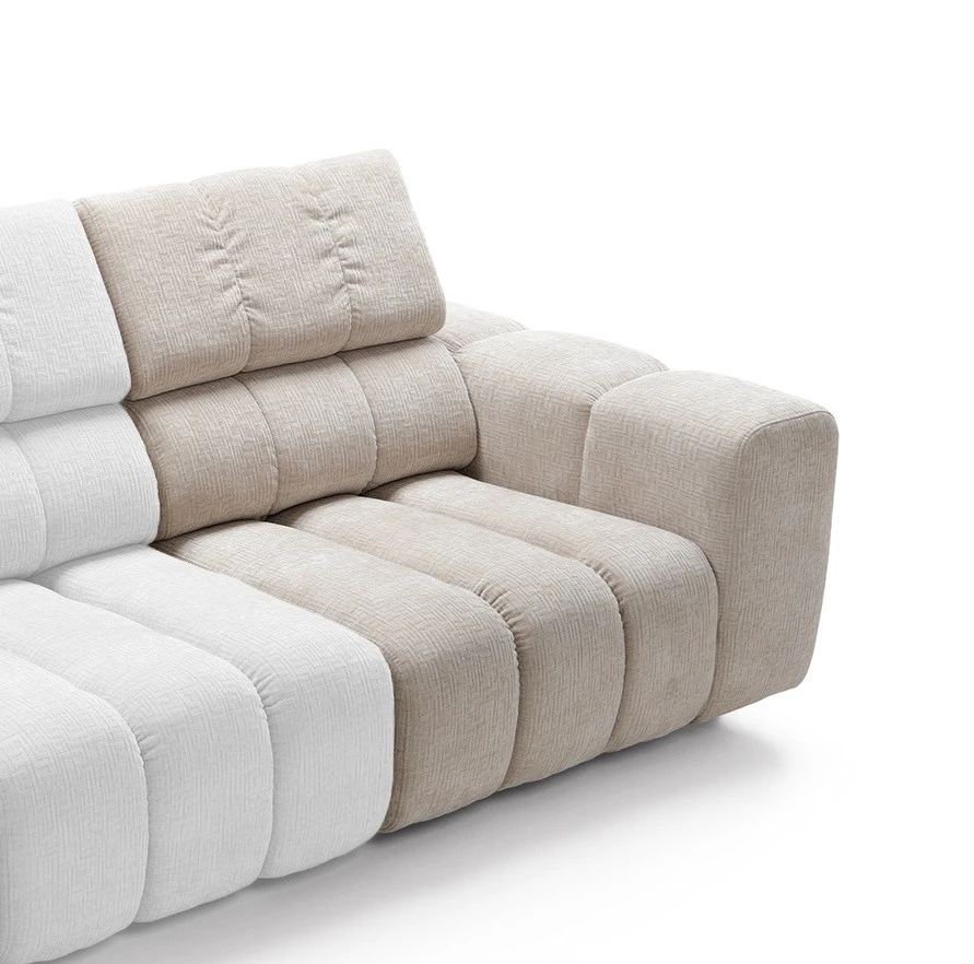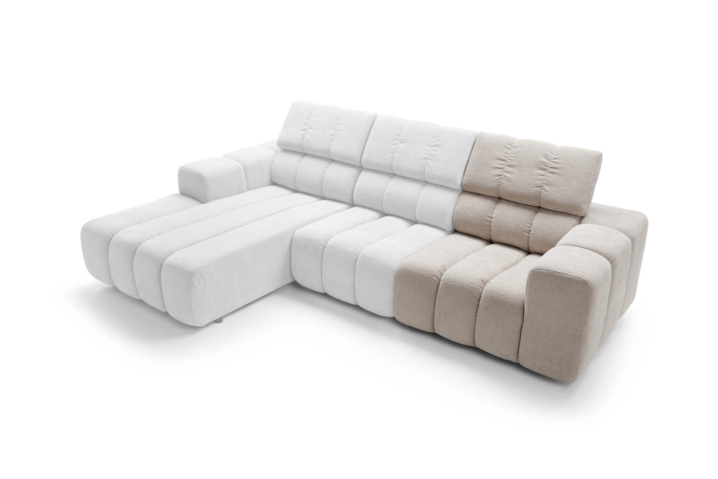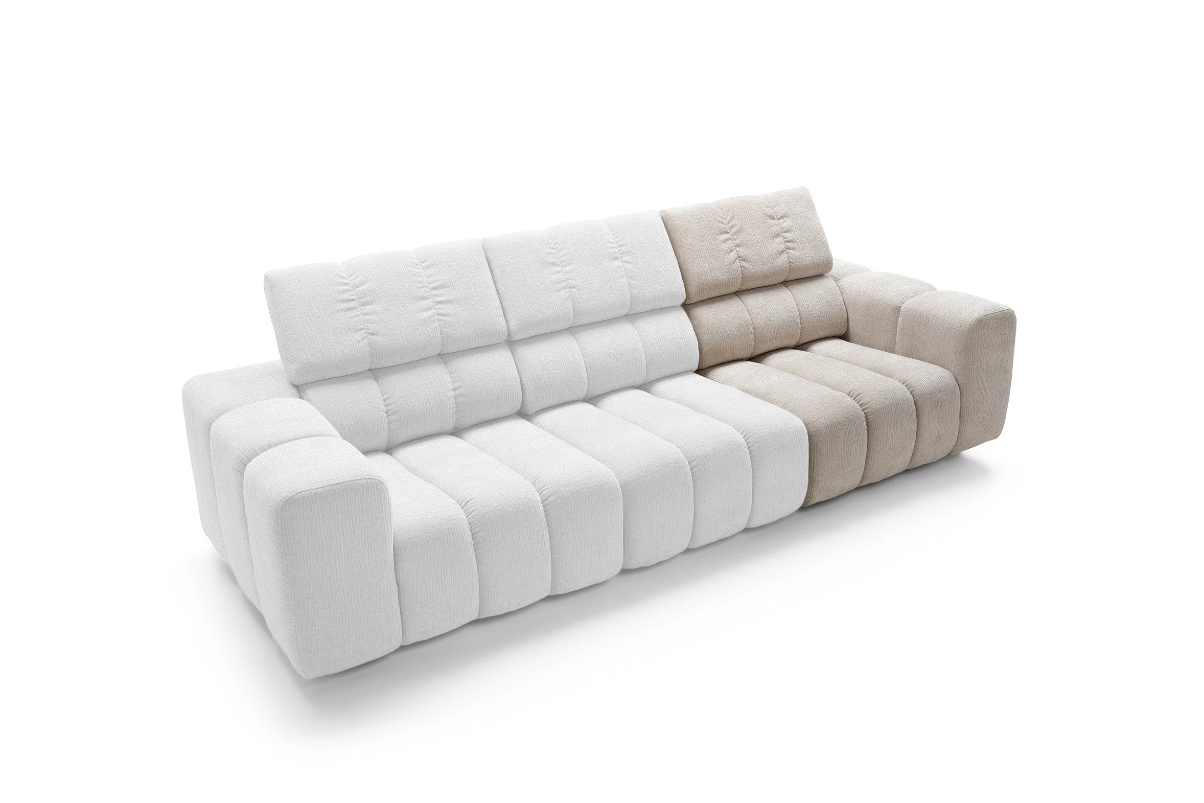 Základem sedací soupravy je robustní konstrukce z masivního dřeva a dřevotřísky. O dokonalé pohodlí se stará kombinace vysoce elastické HR pěny, PUR pěny a pružin faliste, které poskytují měkkost a pocit luxusu. Pro maximální komfort při relaxaci je souprava vybavena polohovatelnými záhlavníky.