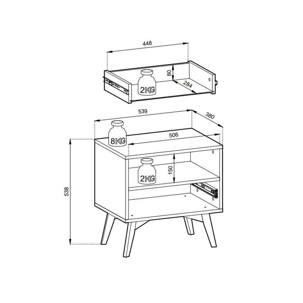 Tento noční stolek kombinuje moderní design a praktické vlastnosti, což ho činí ideálním doplňkem do každé ložnice. Deska je pokrytá odolnou ABS fólií, která ji chrání před poškrábáním a vlhkostí, což zajišťuje dlouhou životnost. Plastové nohy poskytují stabilitu a zároveň dodávají stolku lehký a moderní vzhled. Nábytek je vyroben z kvalitní laminované desky, která je pevná a snadno se udržuje. Kovové úchyty přidávají elegantní detail a usnadňují manipulaci. Tento noční stolek je skvělou volbou pro ty, kteří hledají funkční a stylový kousek nábytku.