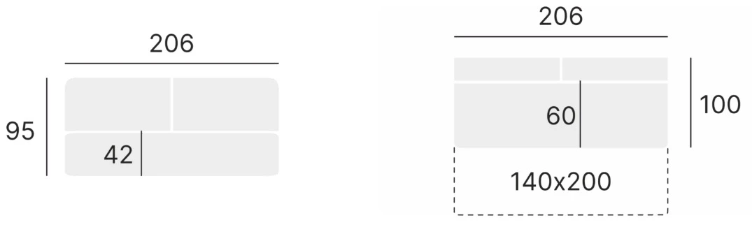 Sedák pohovky tvoří kombinace taštičkových a vlnitých pružin (faliste) spolu s vysoce elastickou HR pěnou, což zaručuje výjimečné pohodlí i dlouhou životnost. Při rozložení se Buffo promění v prostorné lůžko o rozměrech 140×200 cm, ideální pro příležitostné přespání.
