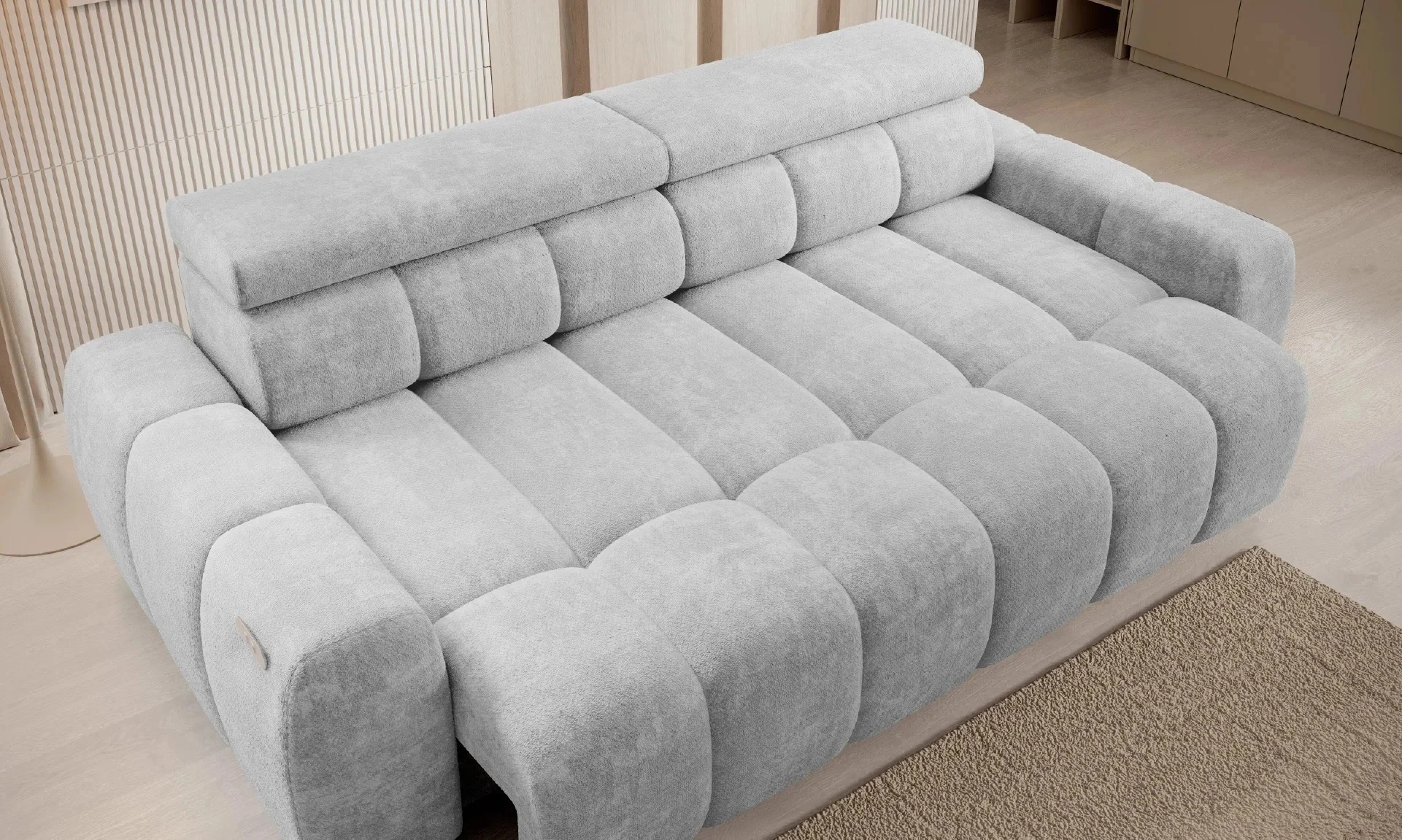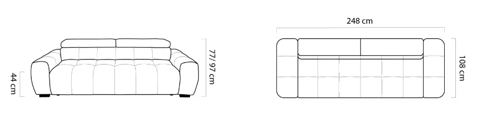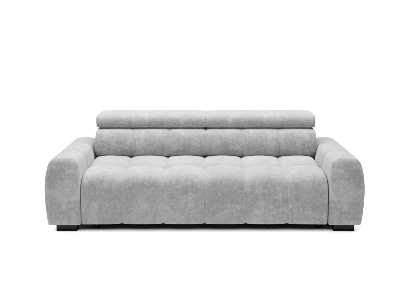 Tato pohovka stojí na minimalistických nožkách o výšce 5 cm a kombinuje masivní vzhled s odlehčeným stylem. Disponuje elektrickým výsuvem sedáku, který umožňuje zvětšit hloubku sedu pro ještě pohodlnější relaxaci. Polohovatelné záhlavníky poskytují individuální nastavení pro maximální komfort při sezení. Konstrukce je vyrobena z borovicového dřeva, MDF a dřevotřísky, což zajišťuje stabilitu a dlouhou životnost. Sedáky obsahují PUR pěnu a vlnité pružiny (faliste) pro optimální podporu a pohodlí. Pohovka má čalouněná záda, takže ji lze umístit volně do prostoru.