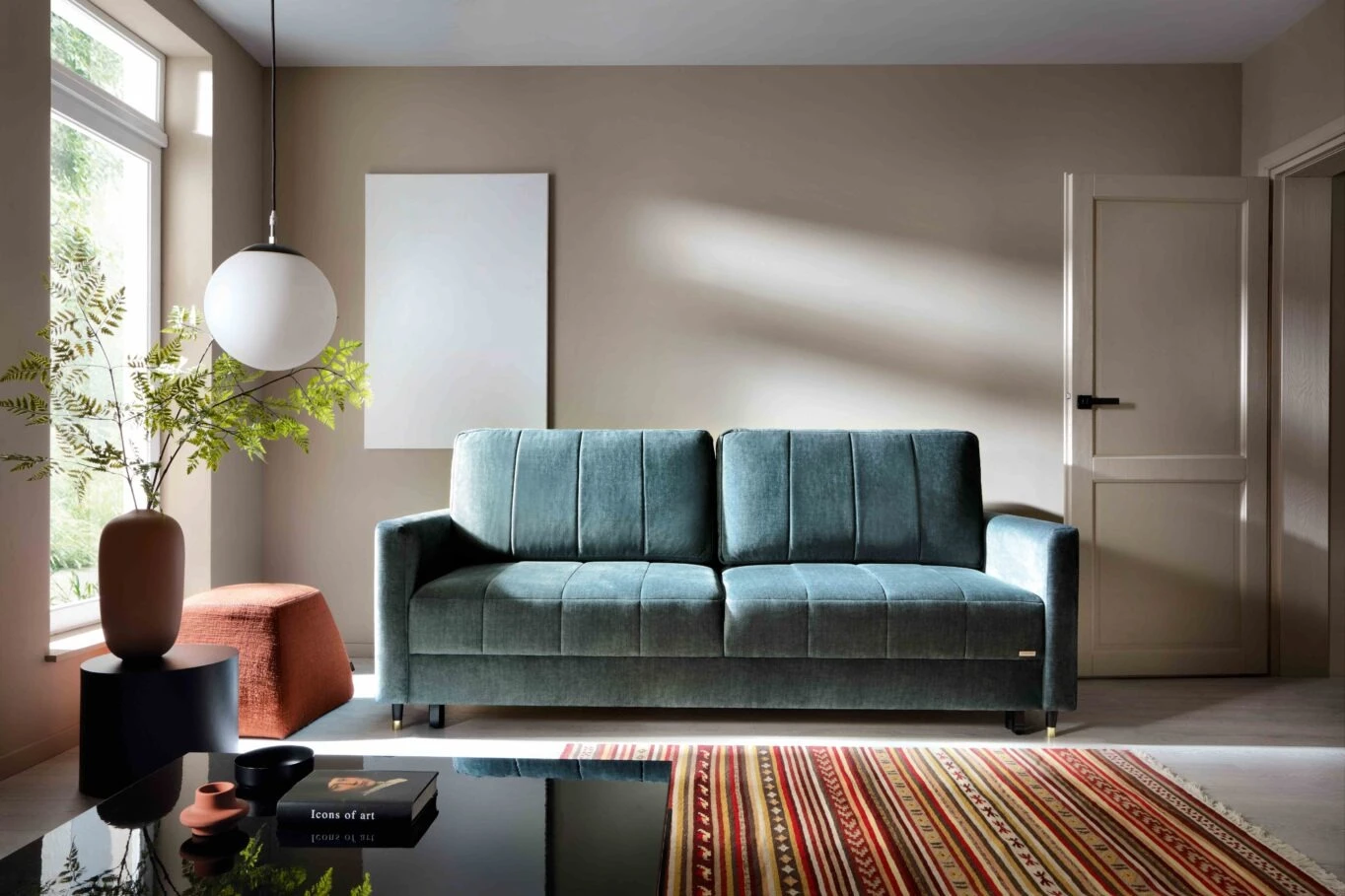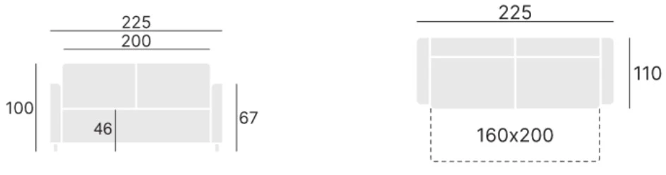 Díky rozkládacímu mechanismu lze z pohovky Hugo snadno vytvořit prostorné lůžko o rozměru 157 × 200 cm, které se skvěle hodí pro příležitostné přespání. Součástí konstrukce je i praktický úložný prostor, ideální pro uložení ložního prádla, dek nebo sezónních doplňků.