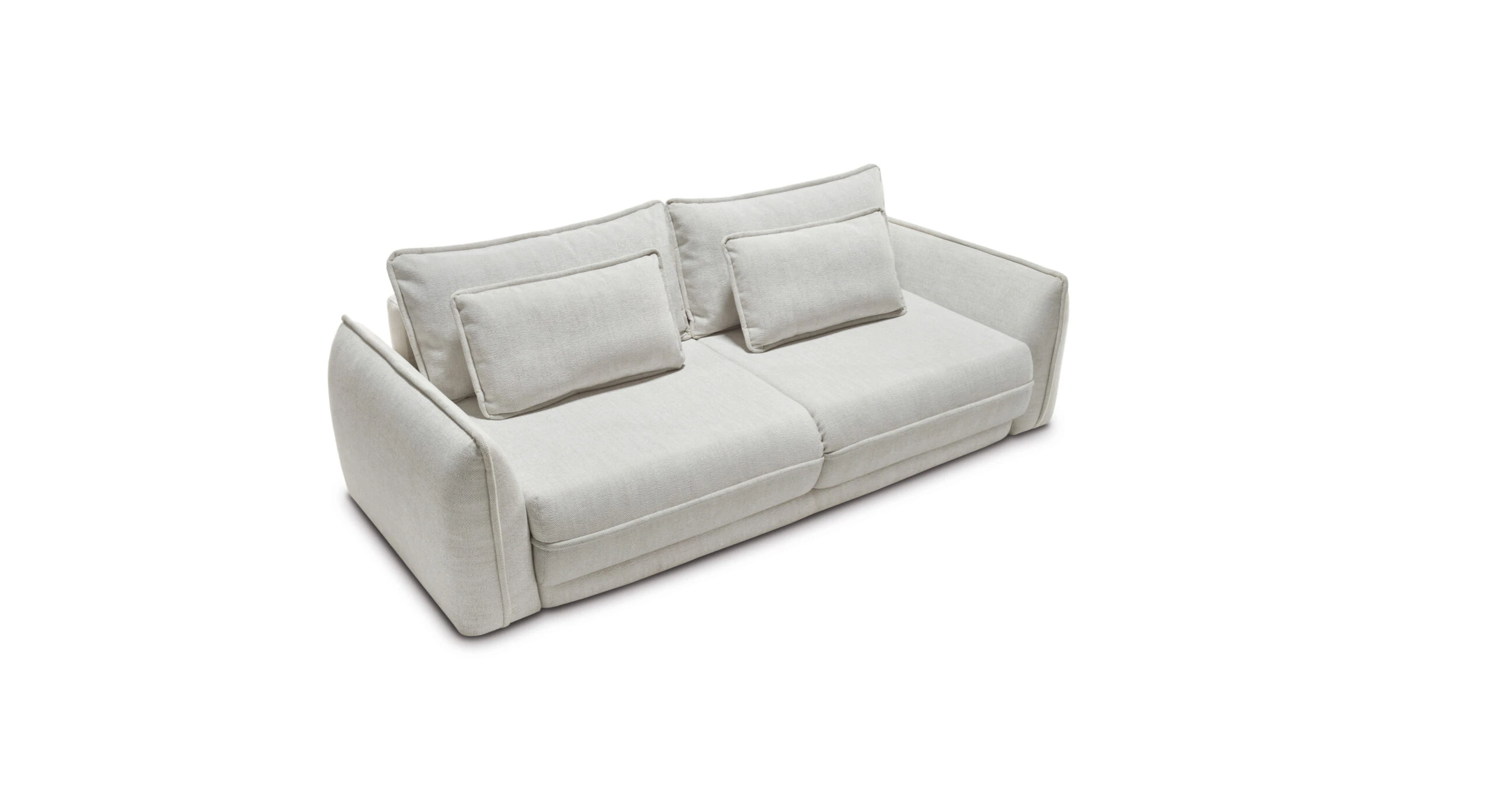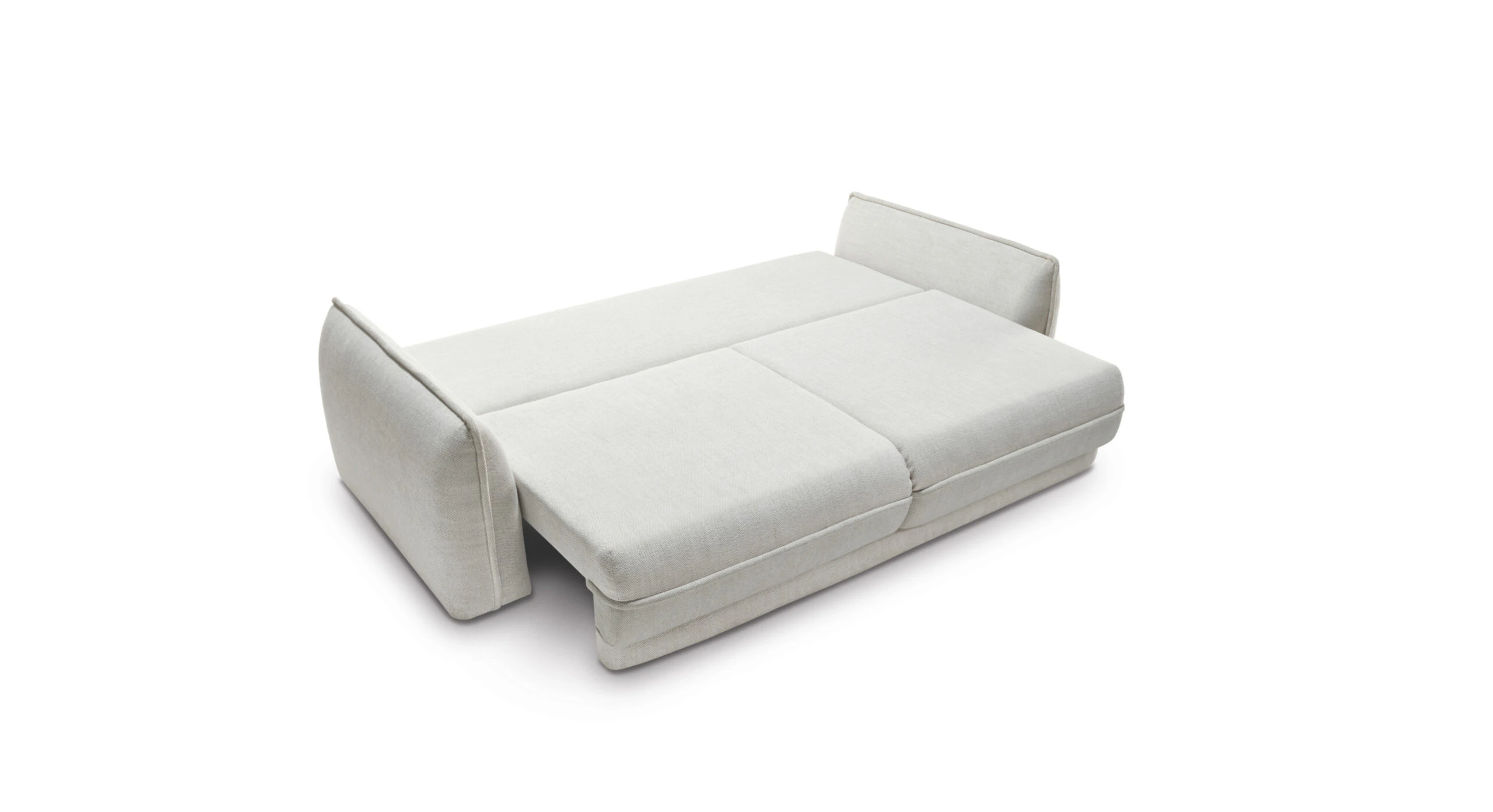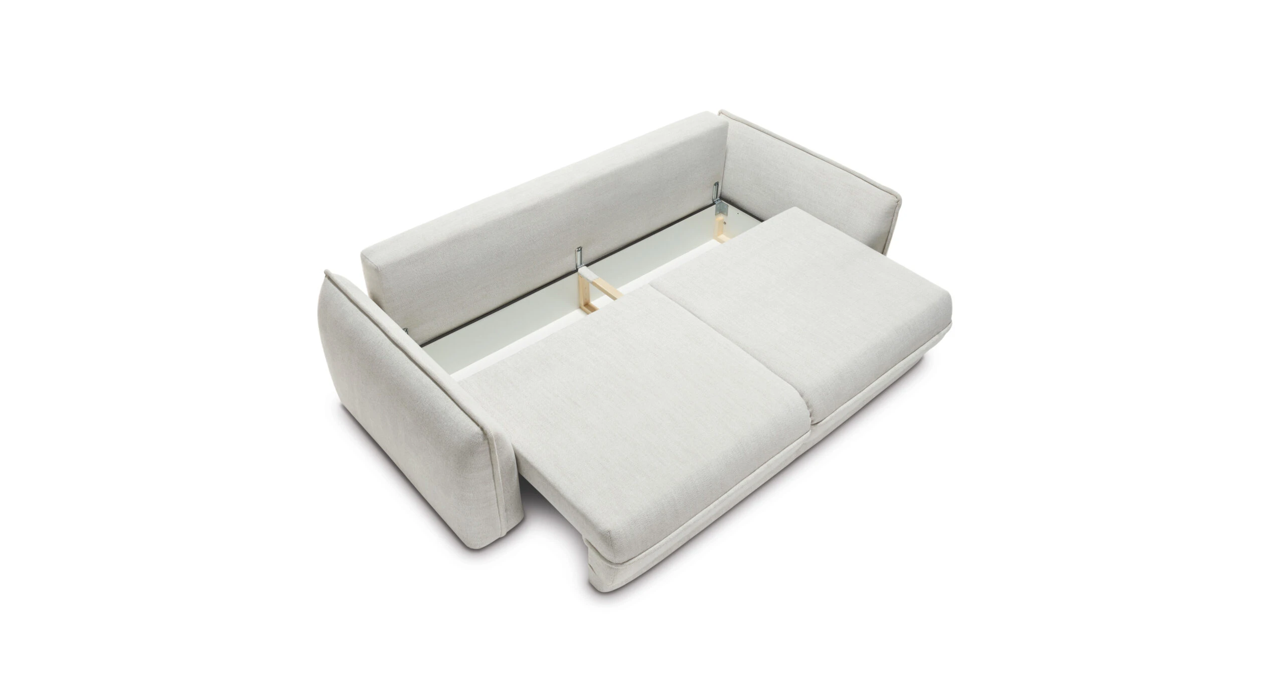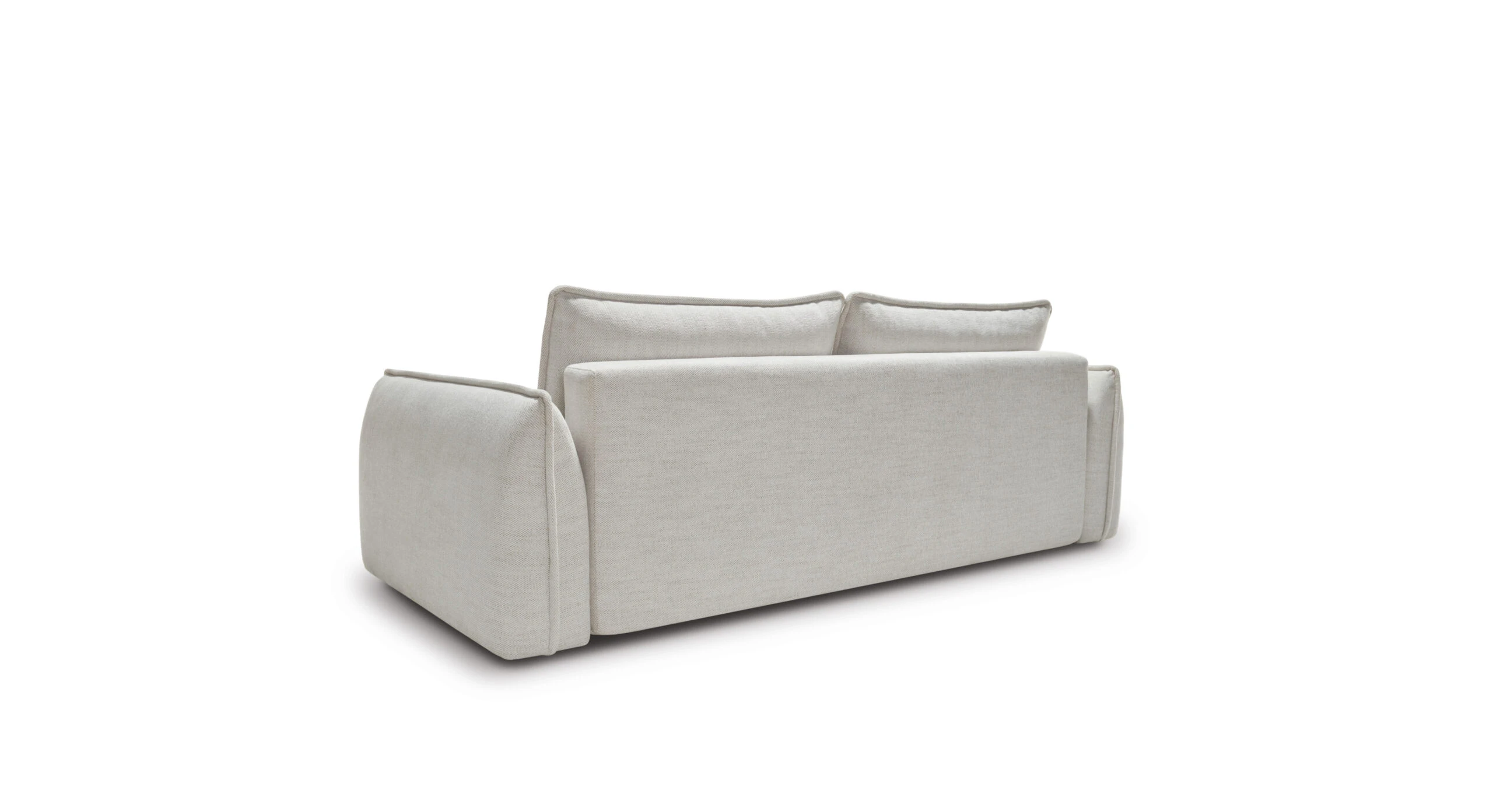 Dva velké opěrné polštáře zvyšují komfort při relaxaci a zároveň vizuálně doplňují čistý vzhled. Pohovku snadno rozložíte na prostornou spací plochu o velikosti 200 × 164 cm, ideální pro příležitostné přespání. Nechybí ani úložný prostor pro deky a lůžkoviny.