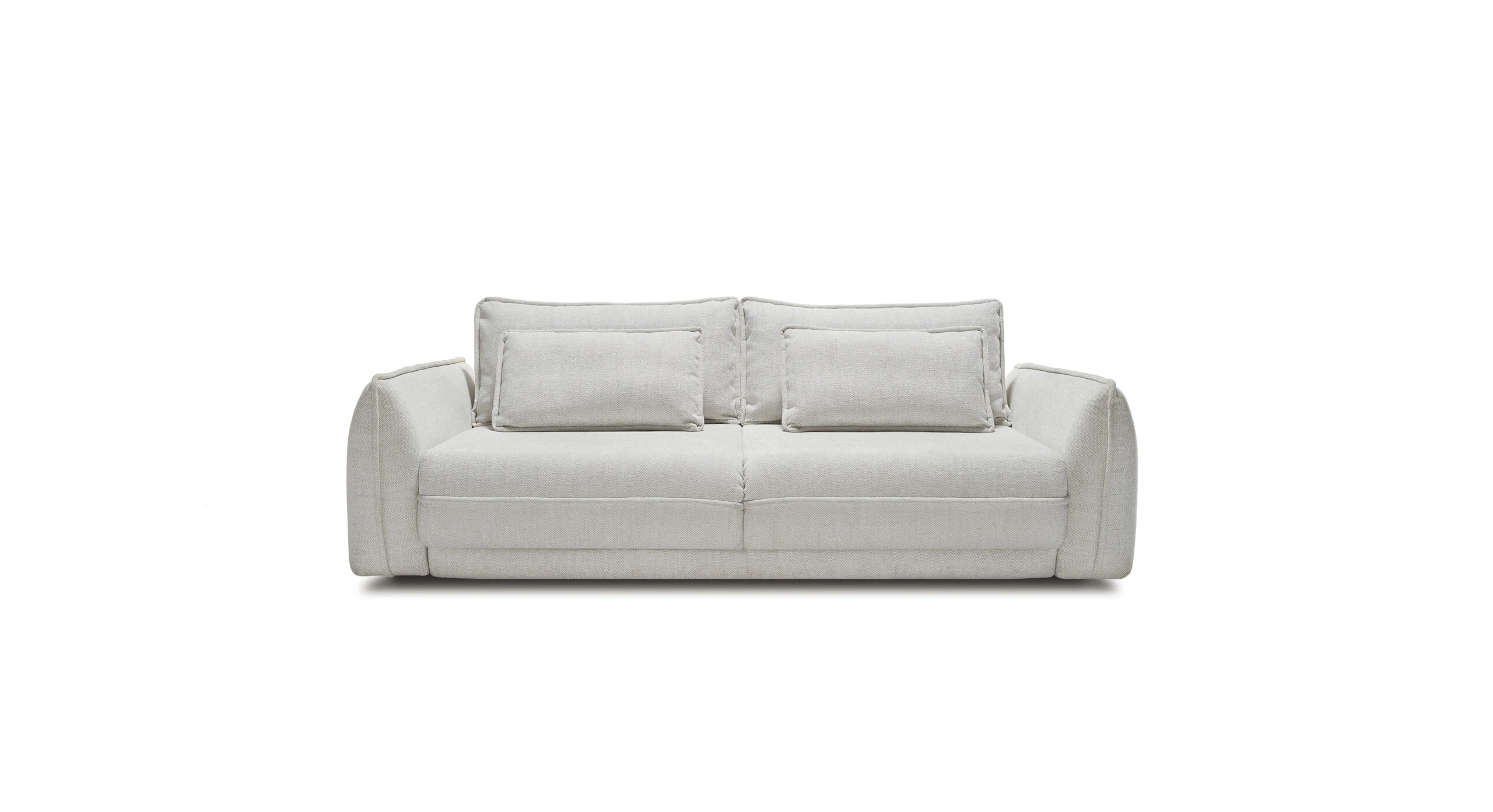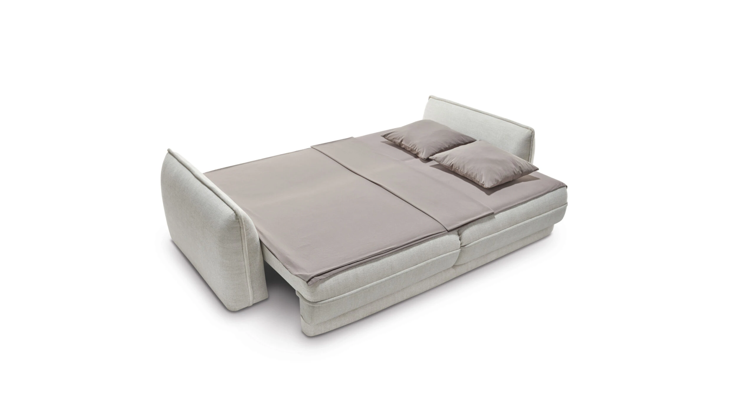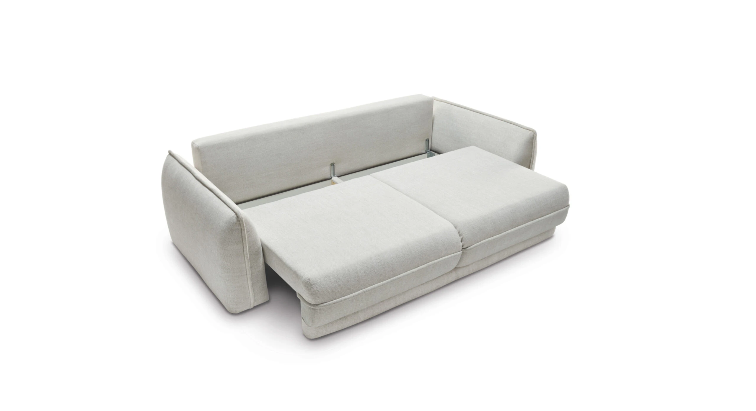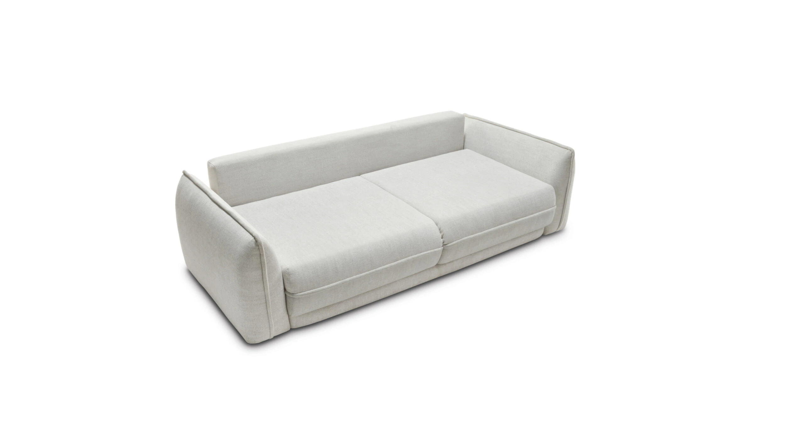Dva velké opěrné polštáře zvyšují komfort při relaxaci a zároveň vizuálně doplňují čistý vzhled. Pohovku snadno rozložíte na prostornou spací plochu o velikosti 200 × 164 cm, ideální pro příležitostné přespání. Nechybí ani úložný prostor pro deky a lůžkoviny.