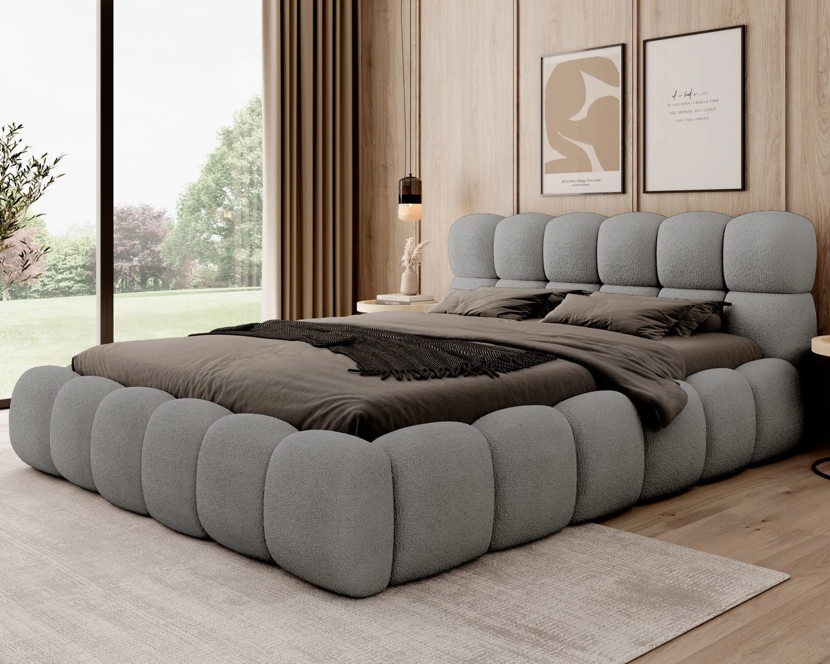 Manželská postel Boston přináší do ložnice eleganci glamour stylu. Kombinuje jednoduchý rám z Boucle tkaniny s vysokým čelem polstrovaným měkkou PUR pěnou pro maximální komfort. Díky nadýchanému prošívání získává postel jedinečný vzhled, který ocení každý milovník nadčasového designu.