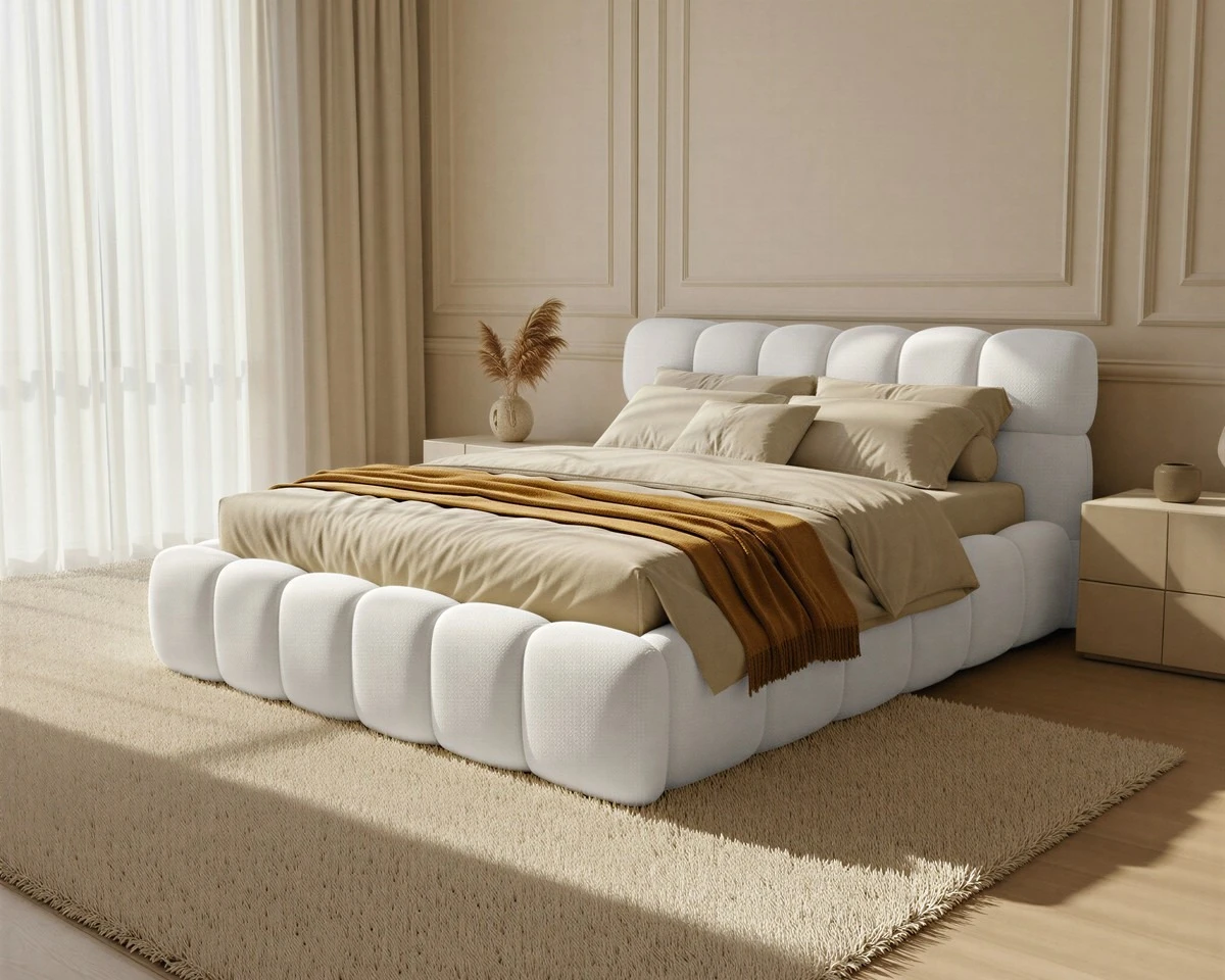 Manželská postel Boston slim přináší do ložnice eleganci glamour stylu. Kombinuje jednoduchý rám z Boucle tkaniny s vysokým čelem polstrovaným měkkou PUR pěnou pro maximální komfort. Díky nadýchanému prošívání získává postel jedinečný vzhled, který ocení každý milovník nadčasového designu.