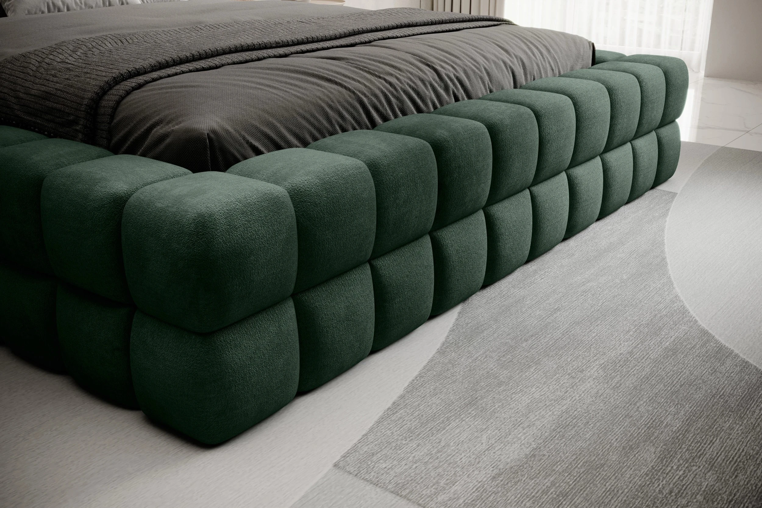 Postel DIZZLE přináší kombinaci stylu a praktičnosti. Její konstrukce je tvořena z masivního dřevadřevotřísky, což zajišťuje vysokou pevnoststabilitu. Měkké části postele jsou vyplněny PUR pěnou, která poskytuje maximální komfort při opření i odpočinku. Výrazné čtvercové prošívání na vysokém čele postele podtrhuje její glamour design.