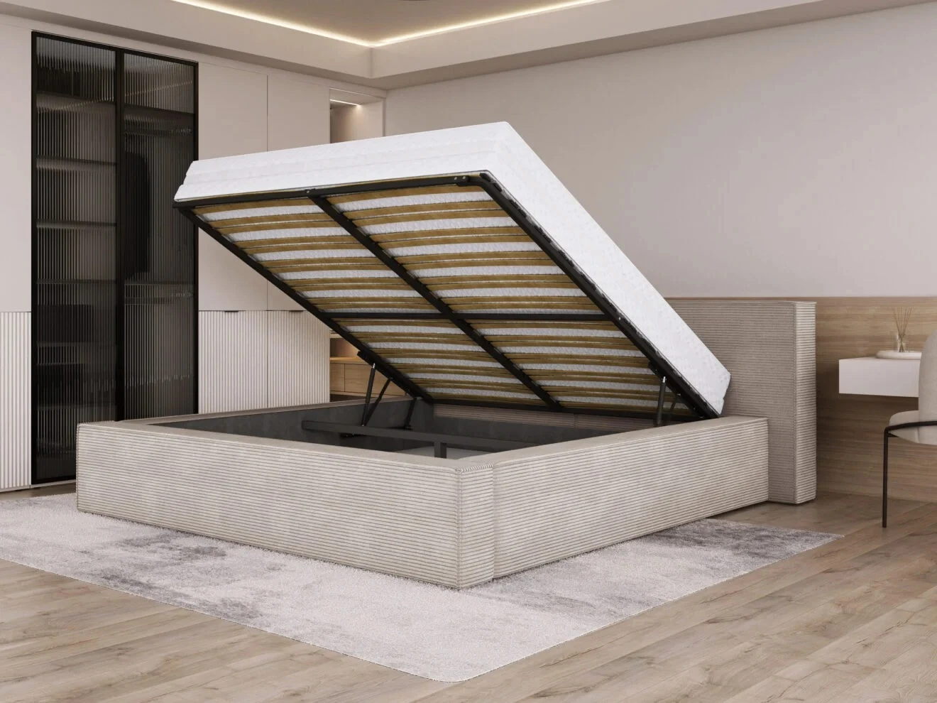 Velkou výhodou je také možnost výběru potahového materiálu – od hladkých látek až po výraznější struktury, například manšestrový vzhled, který dodá posteli osobitý charakter.