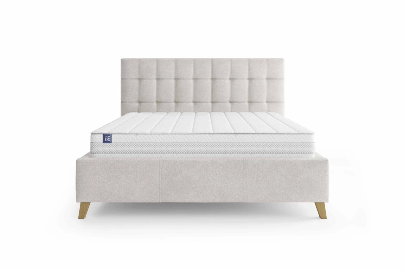 Konstrukce postele je vyrobena z kombinace masivního dřeva a dřevotřísky, což zajišťuje stabilitu a dlouhou životnost. Rám i čelo jsou čalouněné a vyplněné PUR pěnou, která přidává na pohodlí a měkkosti. Postel stojí na pevných dřevěných nožkách o výšce 10 cm, které nejen podtrhují její design, ale také umožňují snadný úklid, a to i robotickým vysavačem.