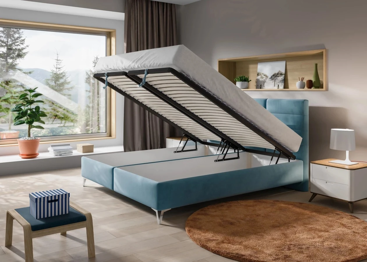 Součástí postele je dvojice vyklápěcích roštů s kovovým rámem, osazených hustě uspořádanými lamelami. Díky plynovým pístům se rošty snadno otevírají a odhalují dva velké úložné prostory, kam uložíte ložní prádlo, deky či sezónní oblečení. Toto řešení ocení každý, kdo hledá nejen krásu, ale i praktičnost.