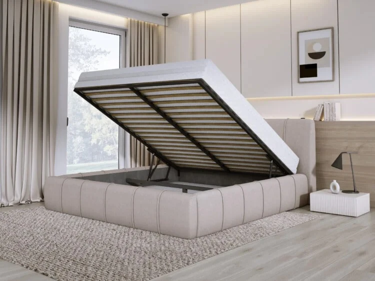 Součástí postele je výklopný rošt s kovovým rámem a plynovými písty, který umožňuje snadný přístup do prostorného úložného prostoru. Ten poskytuje dostatek místa pro lůžkoviny i další věci, které chcete mít vždy po ruce.