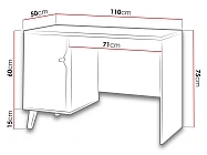 Stůl je vyroben z laminované dřevotřísky. Hrany jsou chráněny páskou z ABS, což zajišťuje odolnost proti poškození. Nožky stolu jsou plastové a mají výšku 15 cm, což přispívá k modernímu vzhledu a stabilitě nábytku. Kovové úchyty dodávají stolu elegantní vzhled, zatímco přední část klávesnice jemně vystupuje, aby ji bylo možné snadno uchopit. Stůl je vybaven válečkovými pojezdy pro plynulý a tichý chod zásuvek.