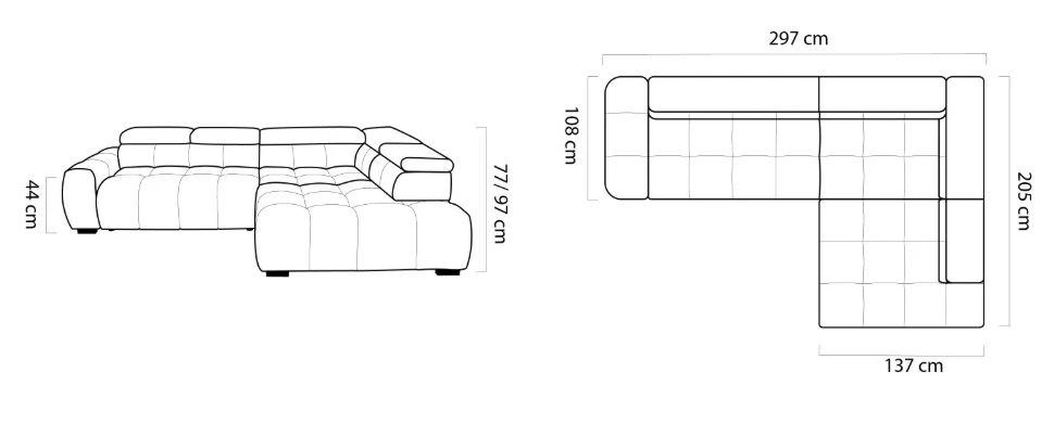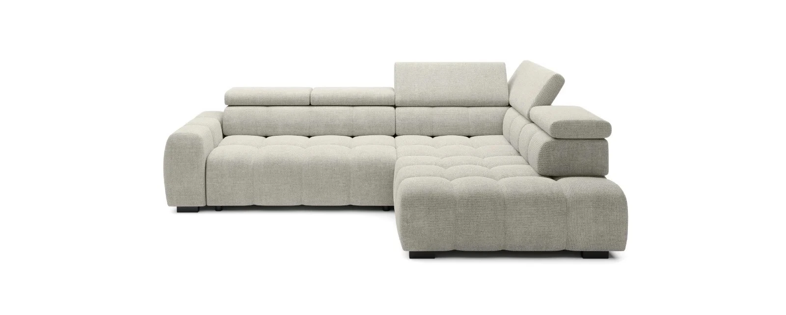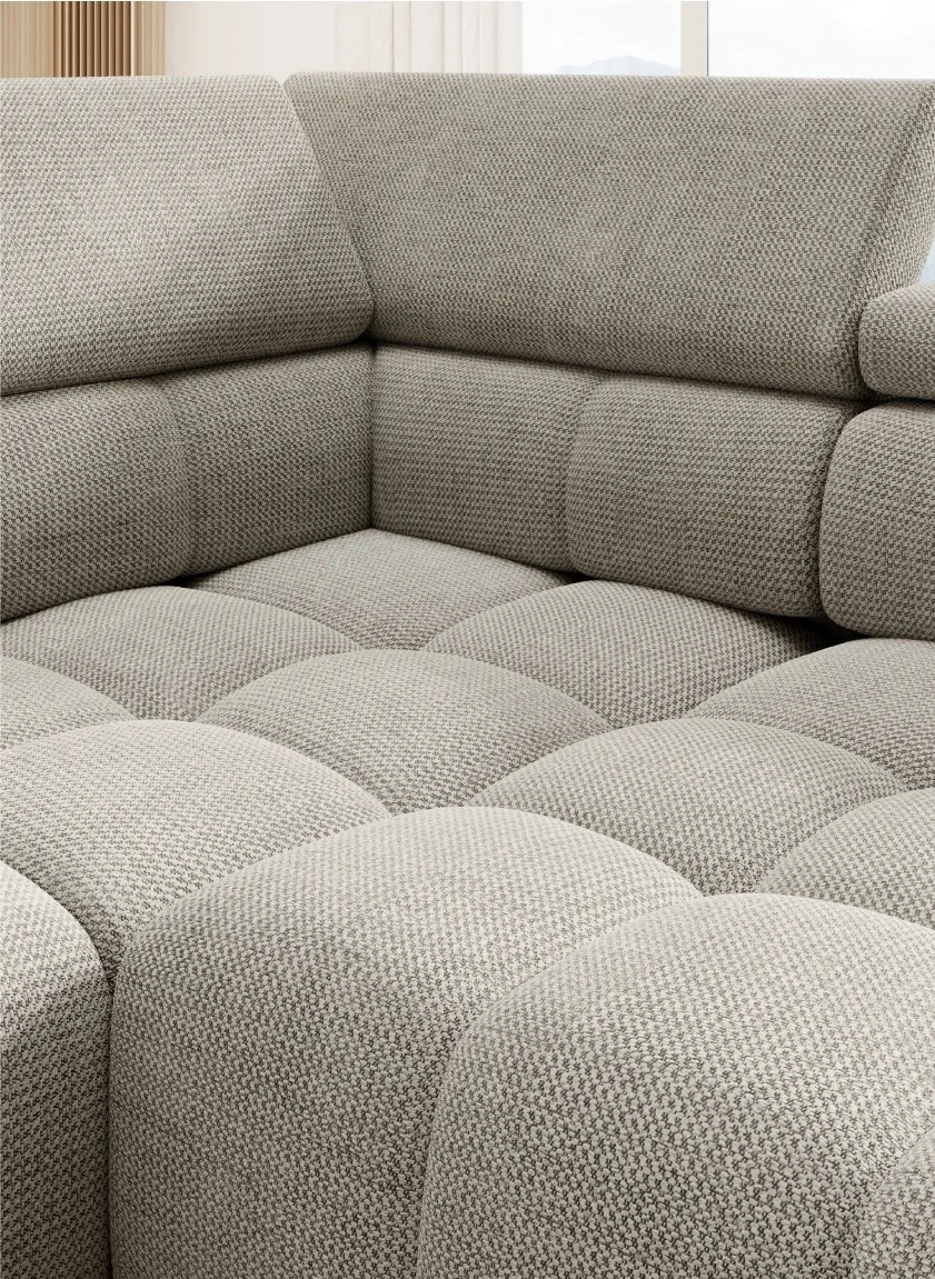 Sedací souprava BULL L zaujme moderním vzhledem a technologickým zpracováním pro náročného uživatele. Hlavní výhodou je elektrický výsuv sedáku, díky kterému si přizpůsobíte hloubku sezení podle aktuální potřeby. Komfort doplňuje 5 polohovatelných záhlavníků, které poskytují individuální oporu hlavy a krku napříč celou délkou soupravy. O pohodlné sezení se stará kombinace PUR pěny a vlnitých pružin (faliste) – ideální pro každodenní relax i hosty. Konstrukce je vyrobena z masivního dřeva a dřevotřísky, což zaručuje pevnost a dlouhou životnost. Design podtrhují nízké černé nožky, které dodávají lehkost a usnadňují úklid pod sedačkou.