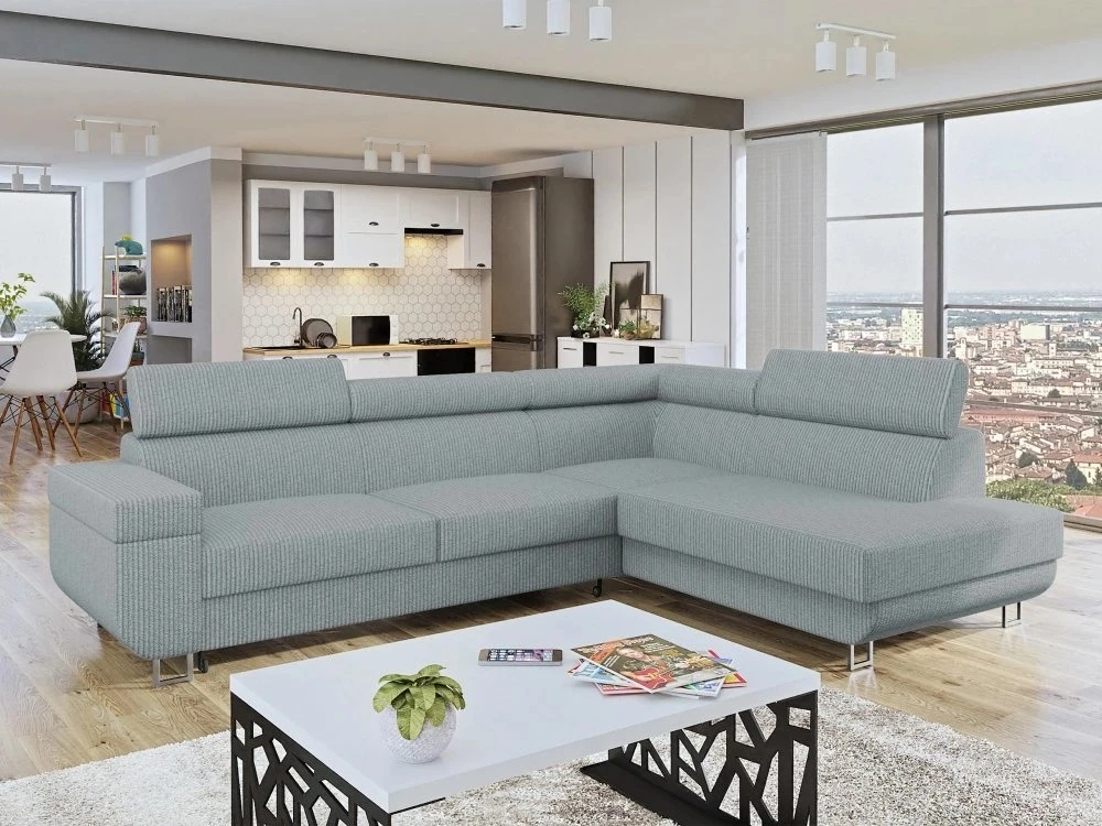 Sedací souprava FONTI v rohovém provedení nabízí pohodlné sezení, variabilní opěrky hlavy a praktické funkce, díky kterým se stane nepostradatelnou součástí vašeho domova. Stylový design doplňují vysoké nožky a čalounění vhodné pro každodenní použití. Ideální volba pro prostorné obývací pokoje.