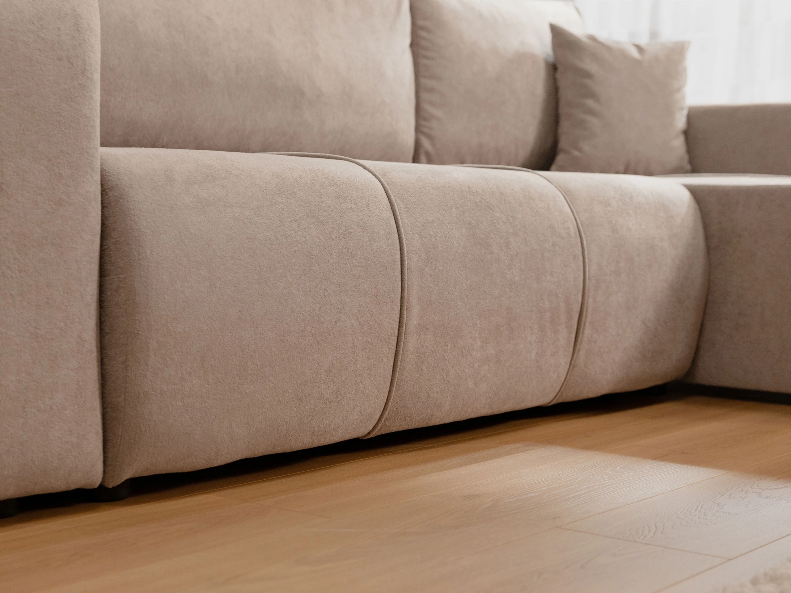 Zádová opěrka je tvořena volně loženými polštáři plněnými pěnovým granulátem. Polštáře jsou součástí balení, mají zipové zapínání a zvyšují komfort i estetiku. Zadní část pohovky je celopotažená látkou, takže je vhodná i pro volné umístění v prostoru. Rohová strana je univerzální – stranu si zvolí zákazník při montáži.