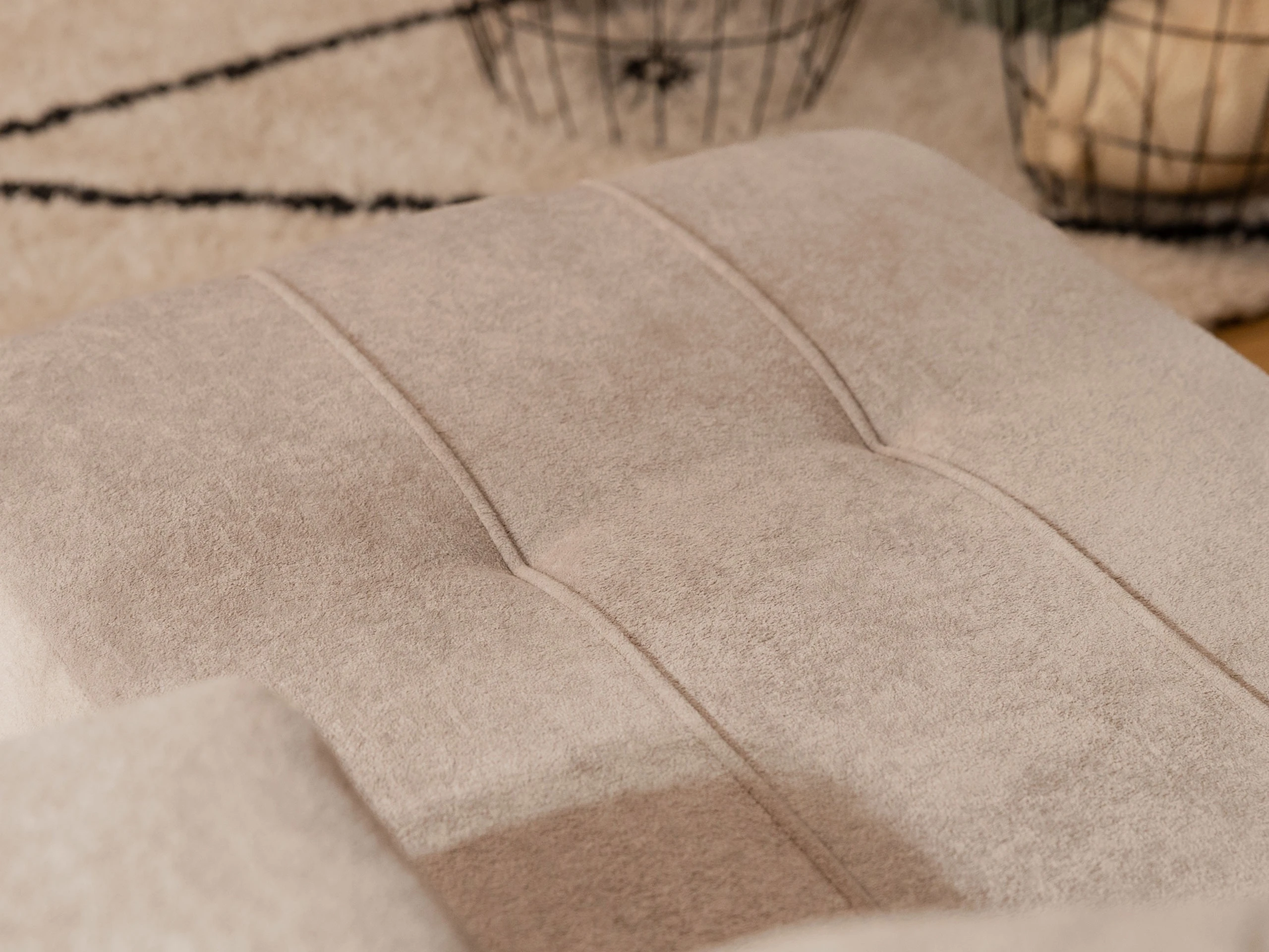Zádová opěrka je tvořena volně loženými polštáři plněnými pěnovým granulátem. Polštáře jsou součástí balení, mají zipové zapínání a zvyšují komfort i estetiku. Zadní část pohovky je celopotažená látkou, takže je vhodná i pro volné umístění v prostoru. Rohová strana je univerzální – stranu si zvolí zákazník při montáži.