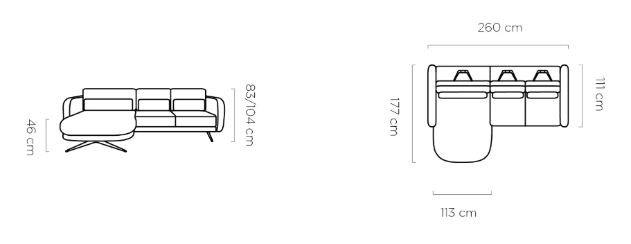 Souprava je vybavena elektrickým výsuvem sedáku, který umožňuje snadno nastavit hloubku sedu dle vašich potřeb. Výsuvná opěradla vám poskytnou individuální přizpůsobení zádové části.