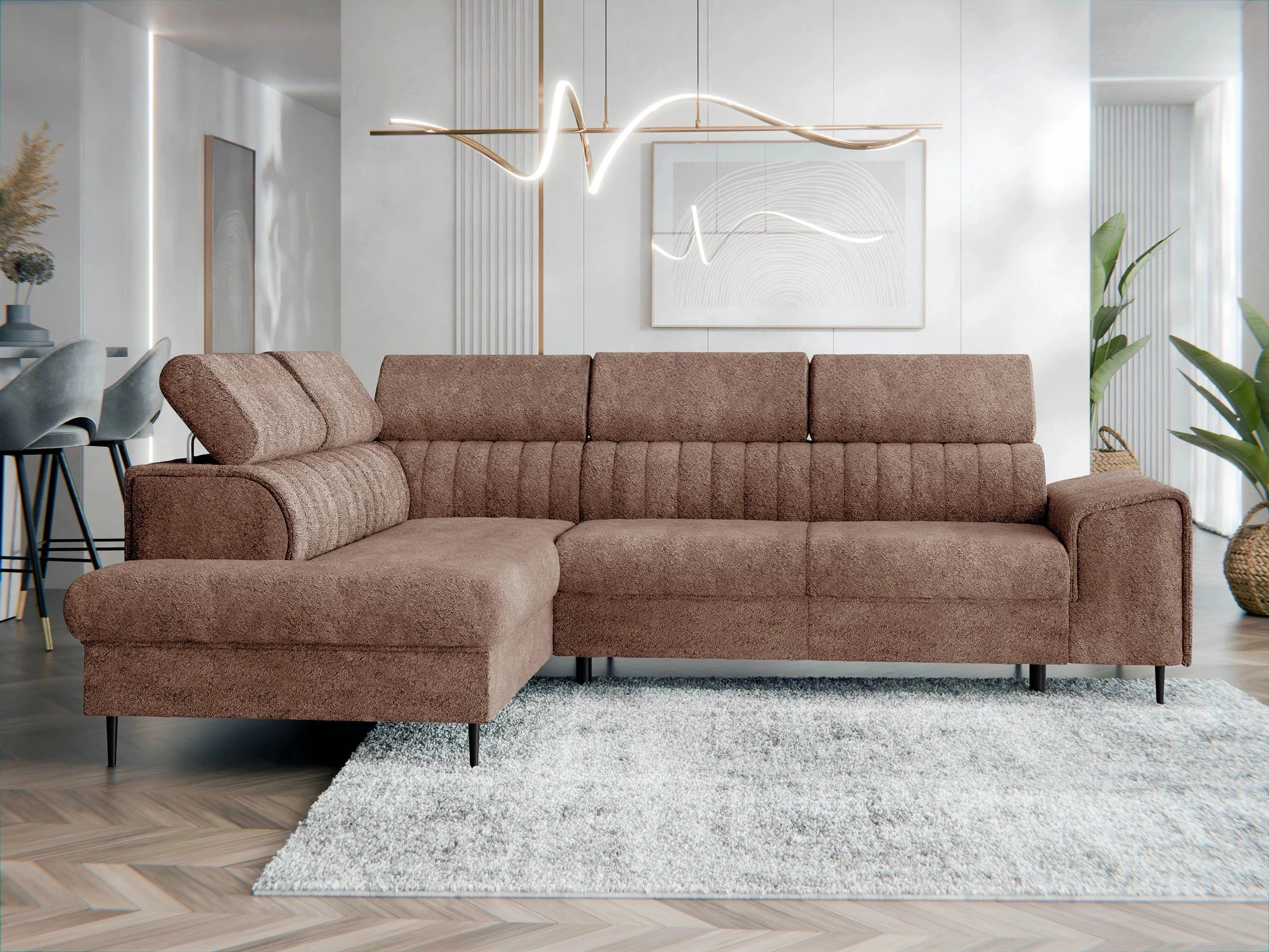 Rohová sedací souprava KADURIN F kombinuje elegantní design s vysokou funkčností, čímž se stává ideálním řešením pro moderní interiéry. Nabízí nejen pohodlí pro každodenní sezení, ale také praktické prvky jako je rozklad na spaní, úložný prostor a polohovatelné záhlavníky pro maximální komfort.