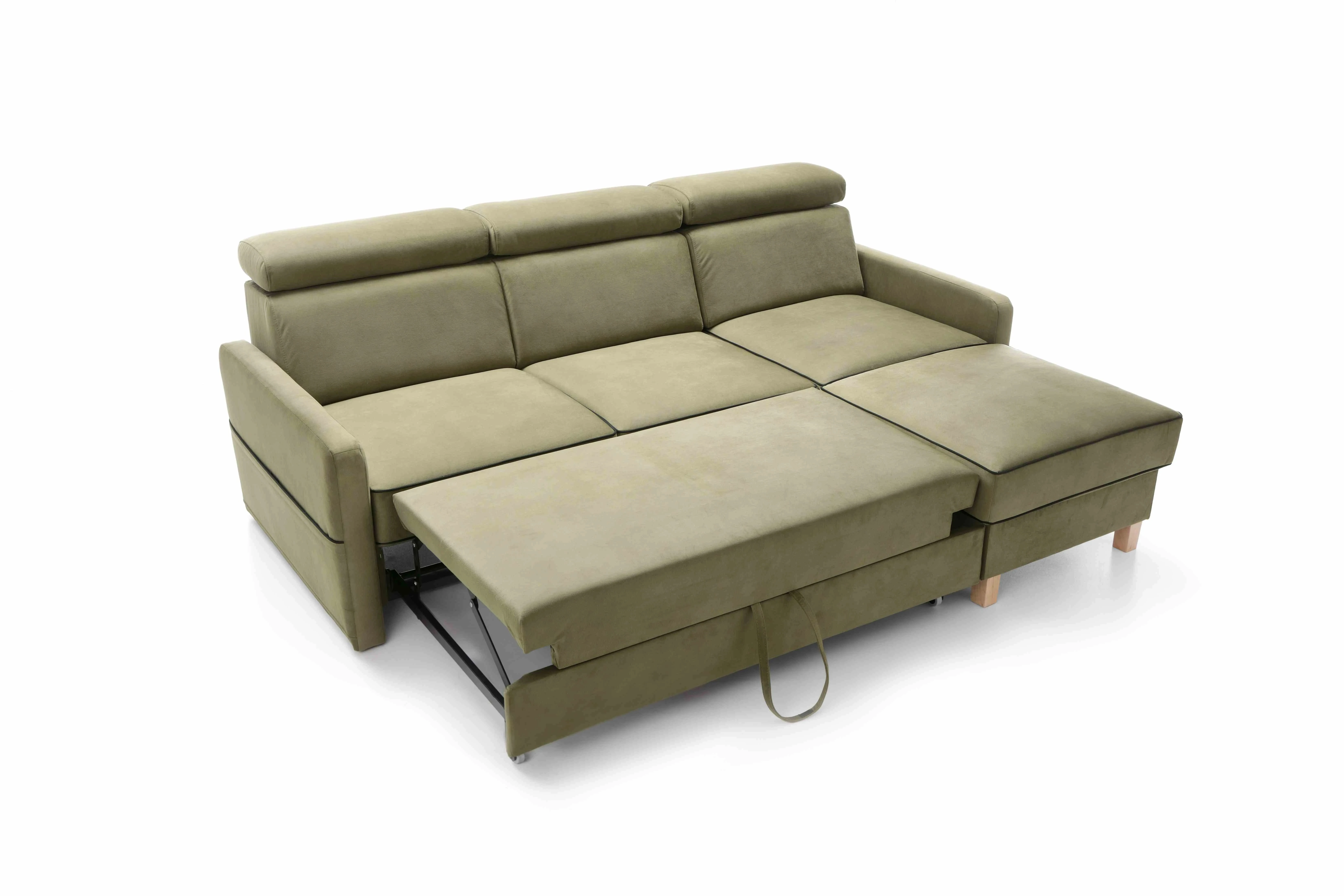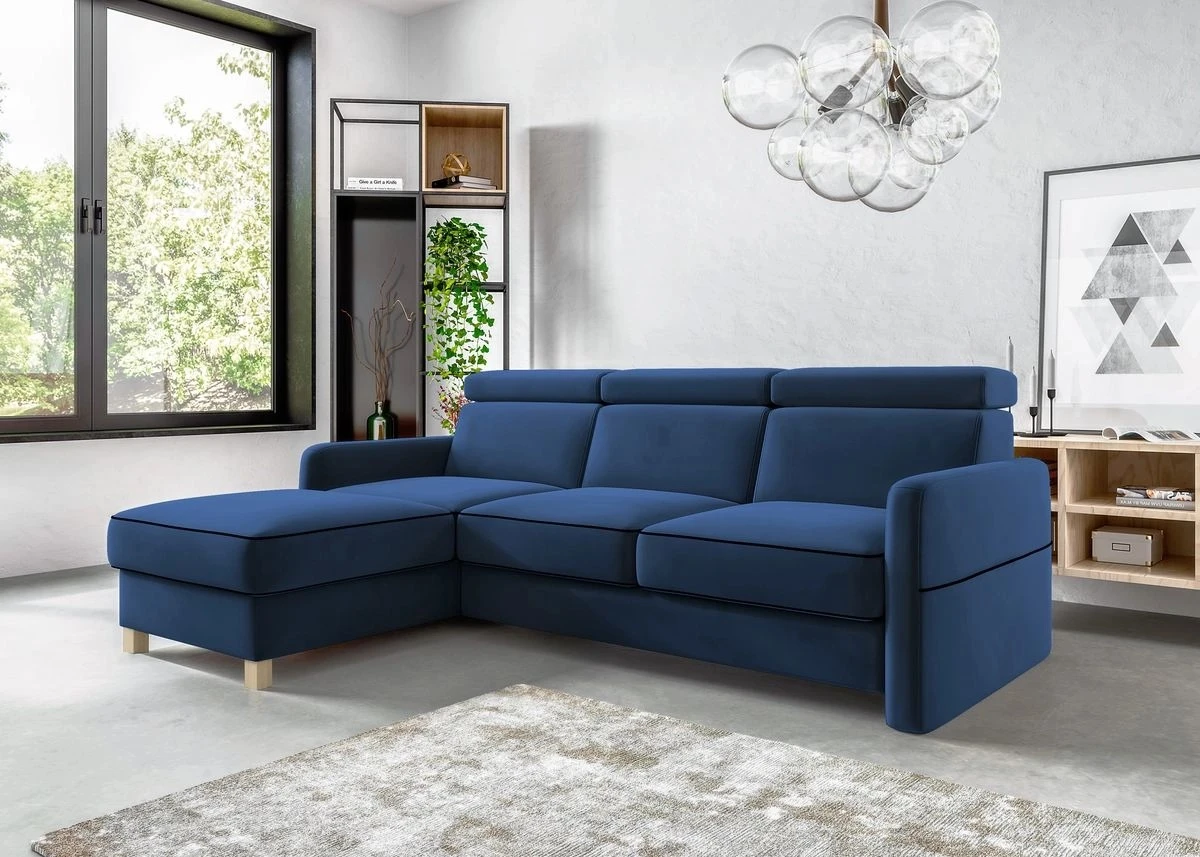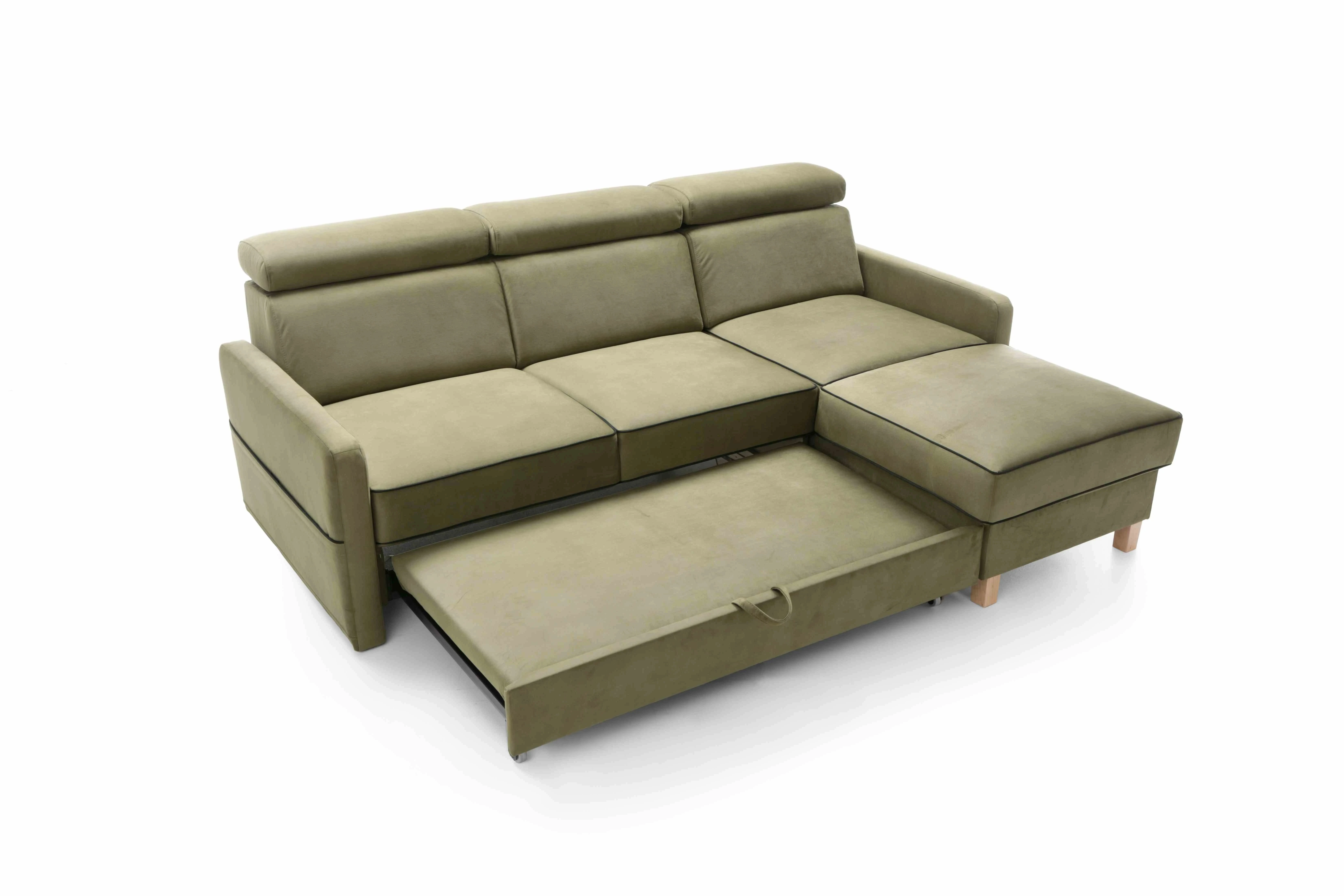 Sedačka je vybavena polohovatelnými záhlavníky, které umožňují individuální nastavení opory hlavy a krku pro maximální pohodlí. Praktická rozkládací funkce promění sedačku na lůžko o rozměrech 200 × 125 cm, ideální pro příležitostné přespání.