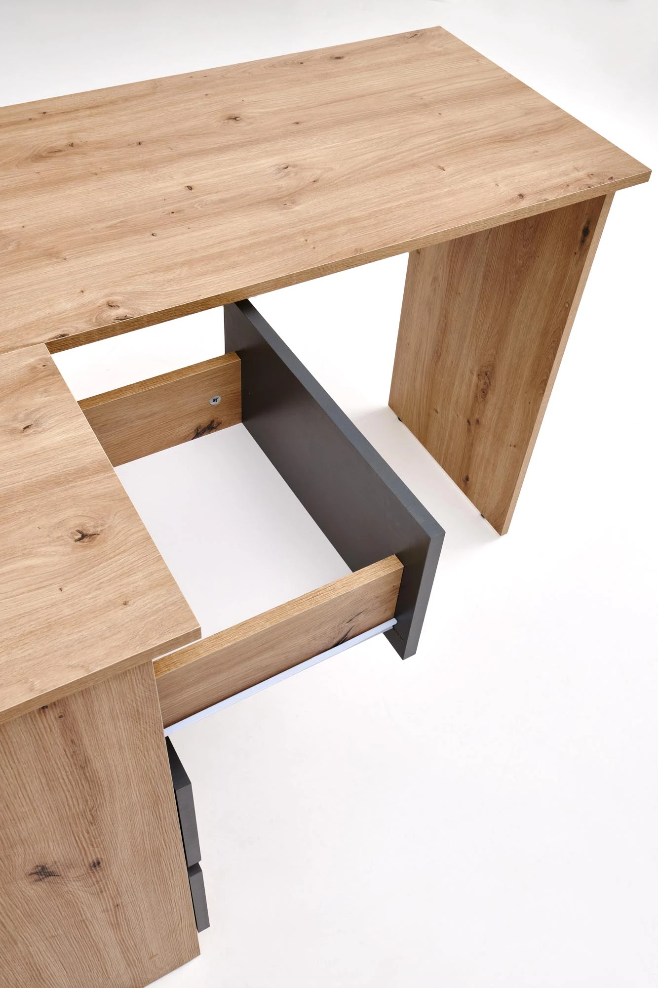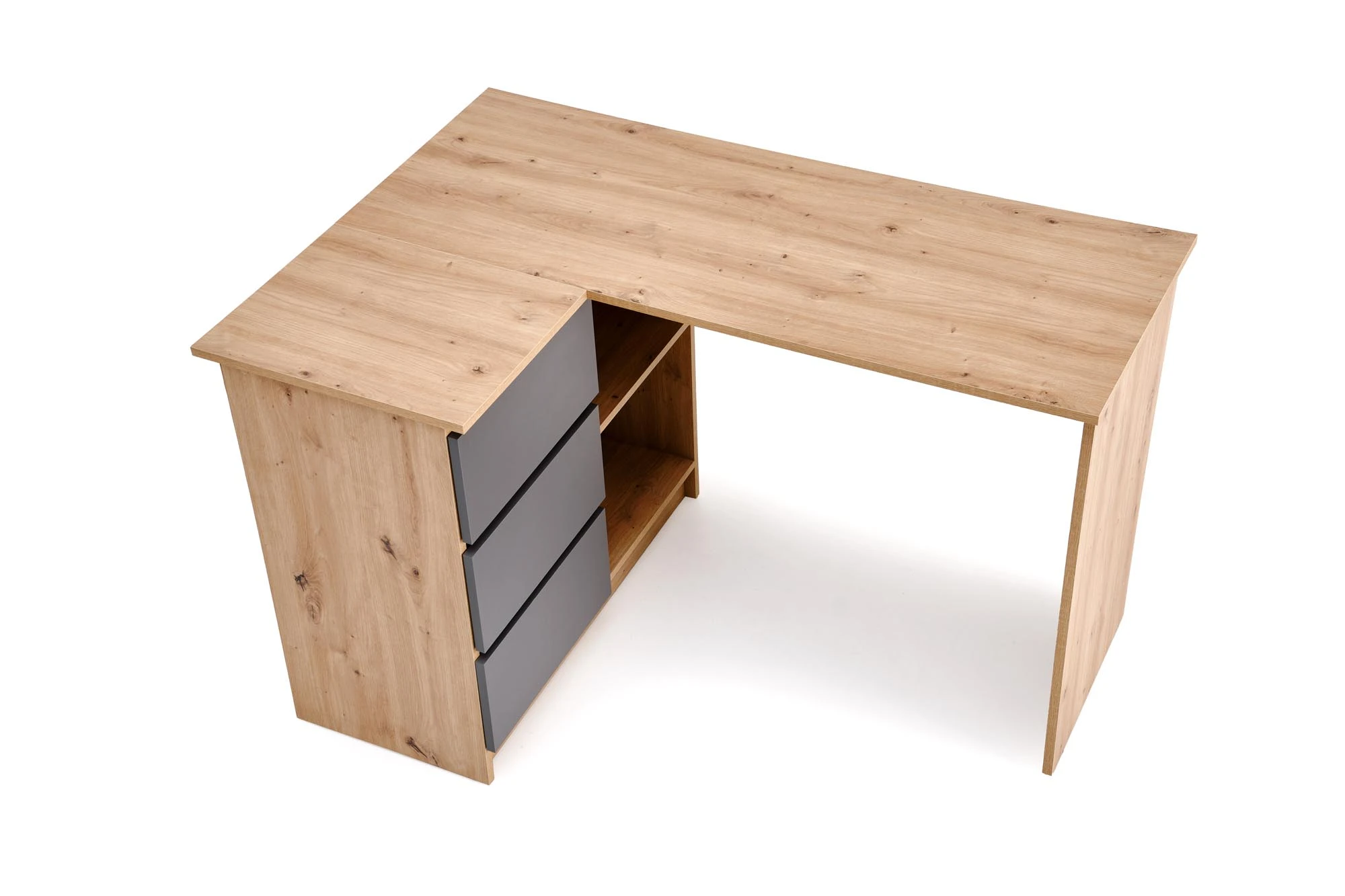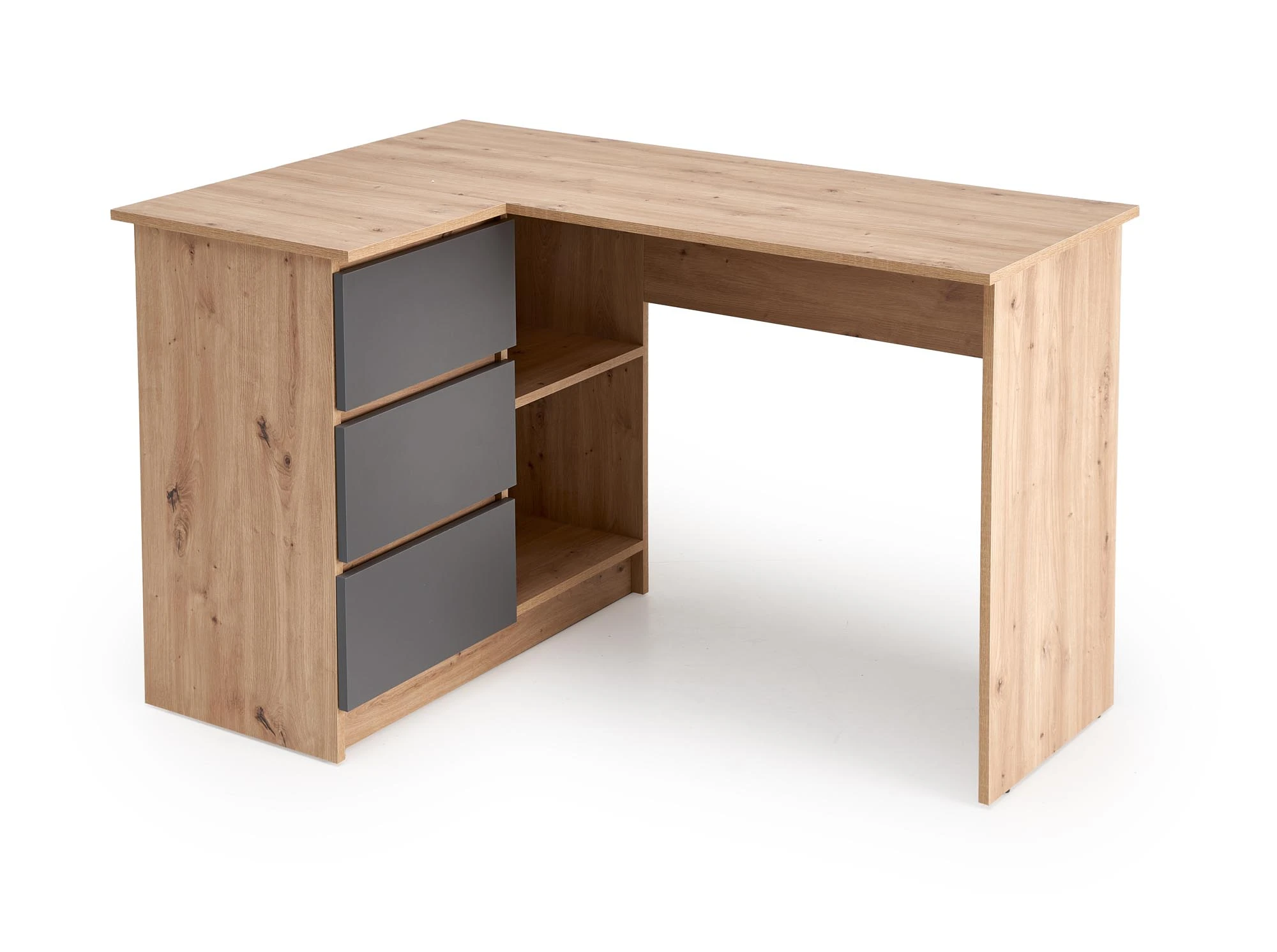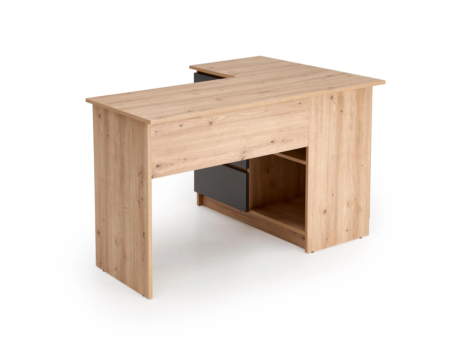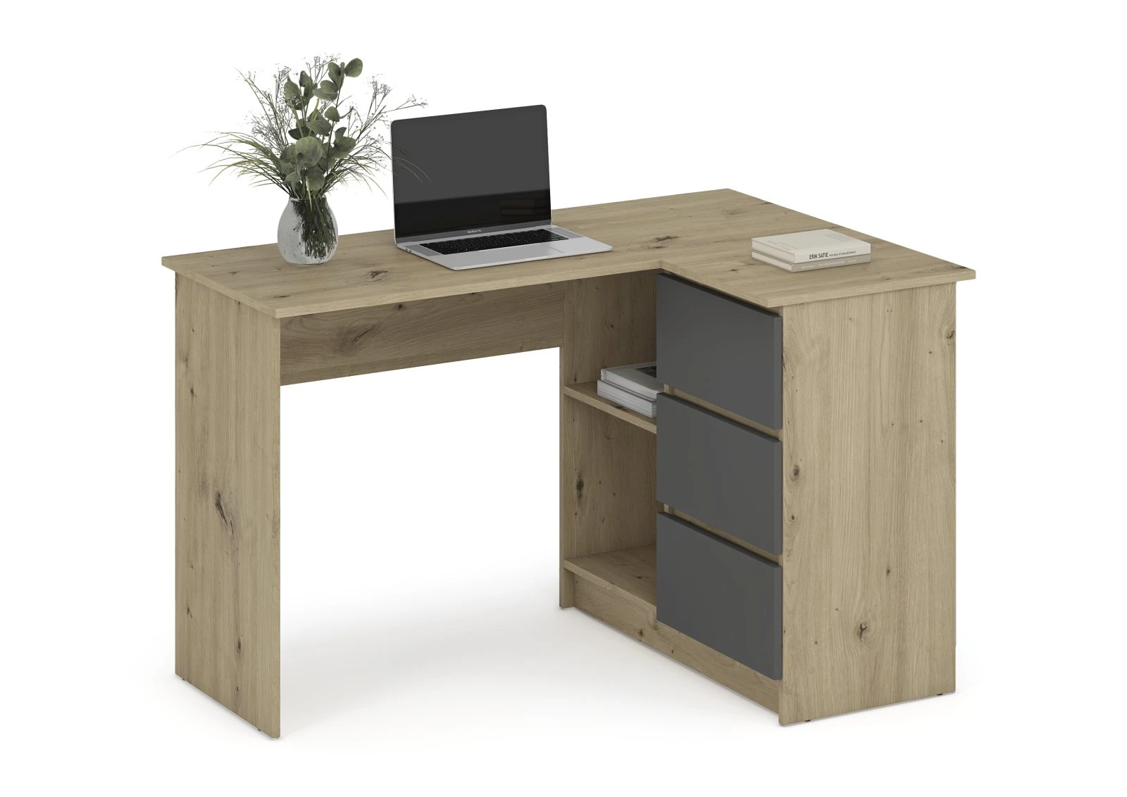 Biurko disponuje třemi zásuvkami a otevřenými policemi, které umožňují přehledné uložení kancelářských potřeb, knih i drobností. Díky tomu zůstává pracovní plocha čistá a organizovaná.