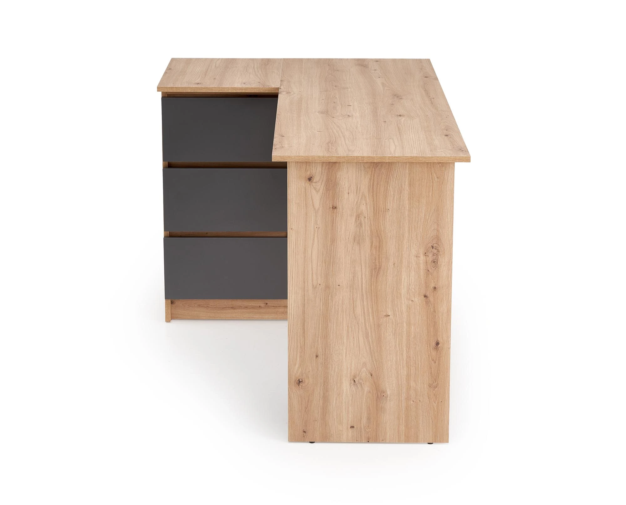 Konstrukce je vyrobena z laminované nábytkové desky, která je odolná vůči běžnému opotřebení a snadná na údržbu. Kombinace teplého dekoru dřeva a tmavého grafitu vytváří moderní kontrast vhodný do pracovny, studentského pokoje i domácí kanceláře.