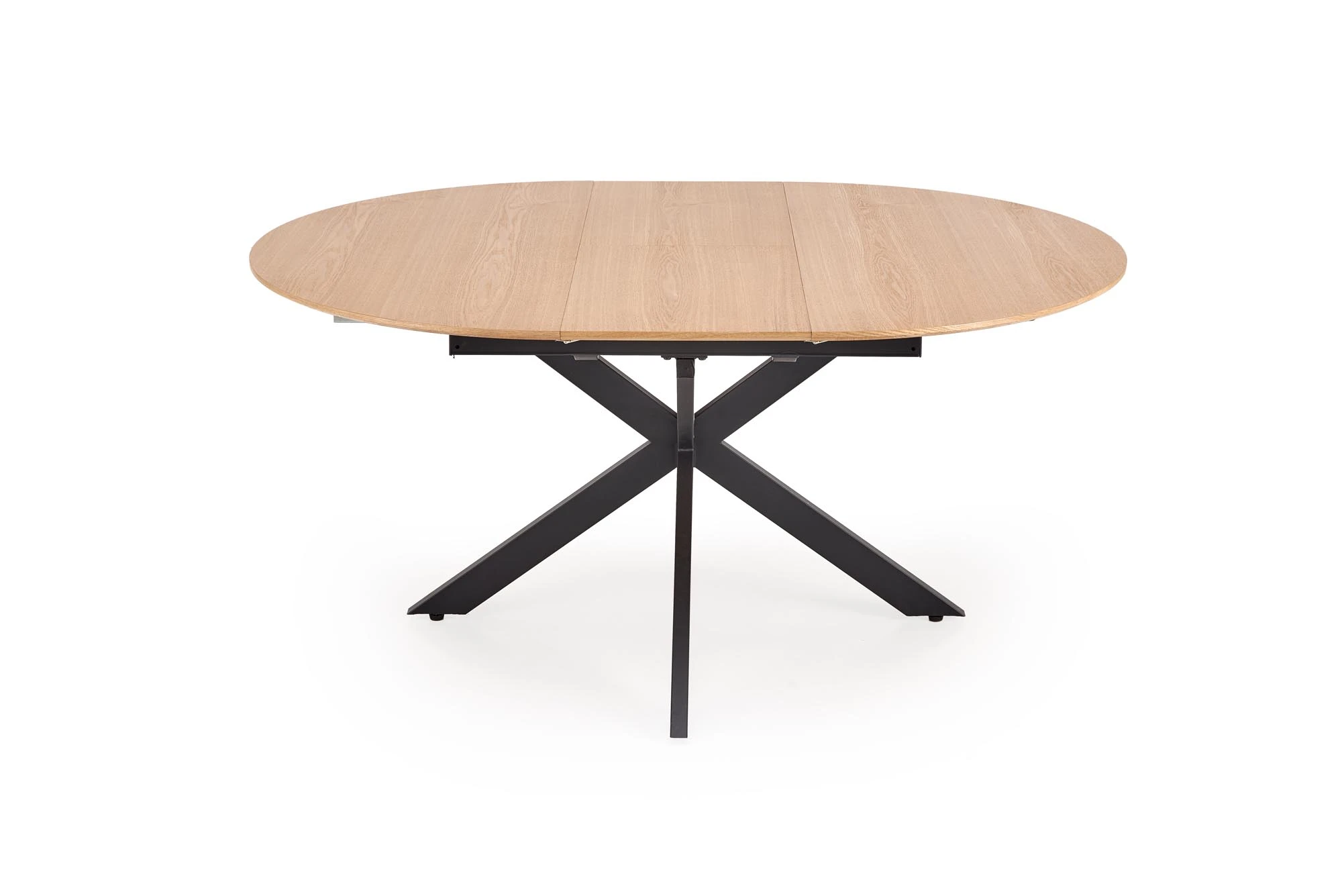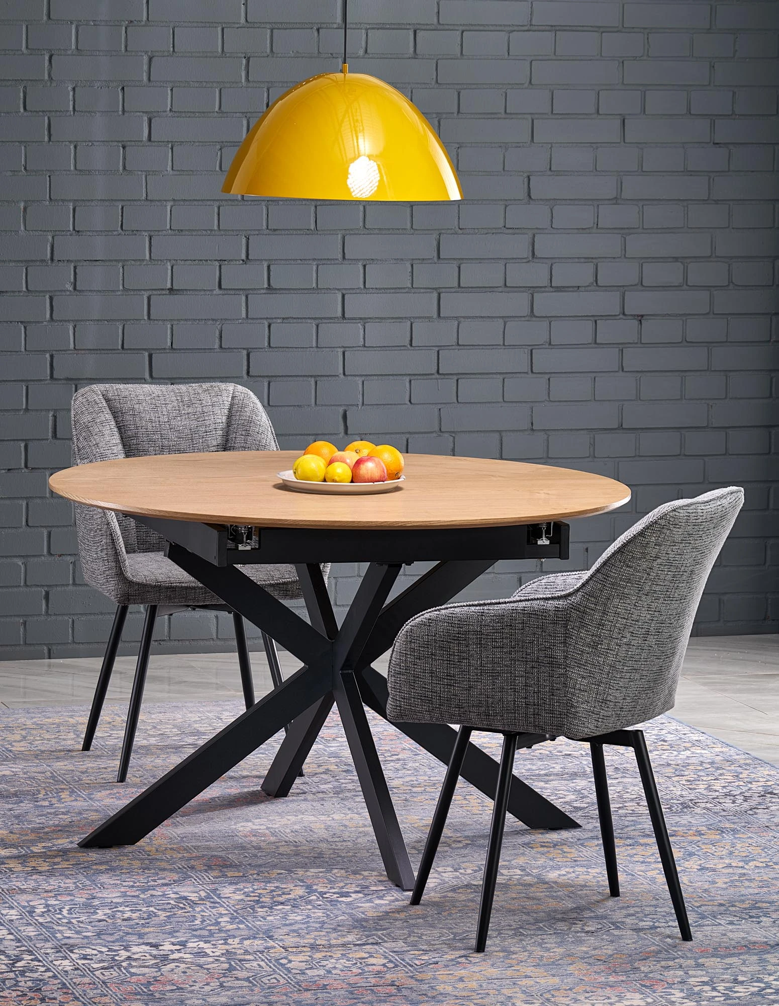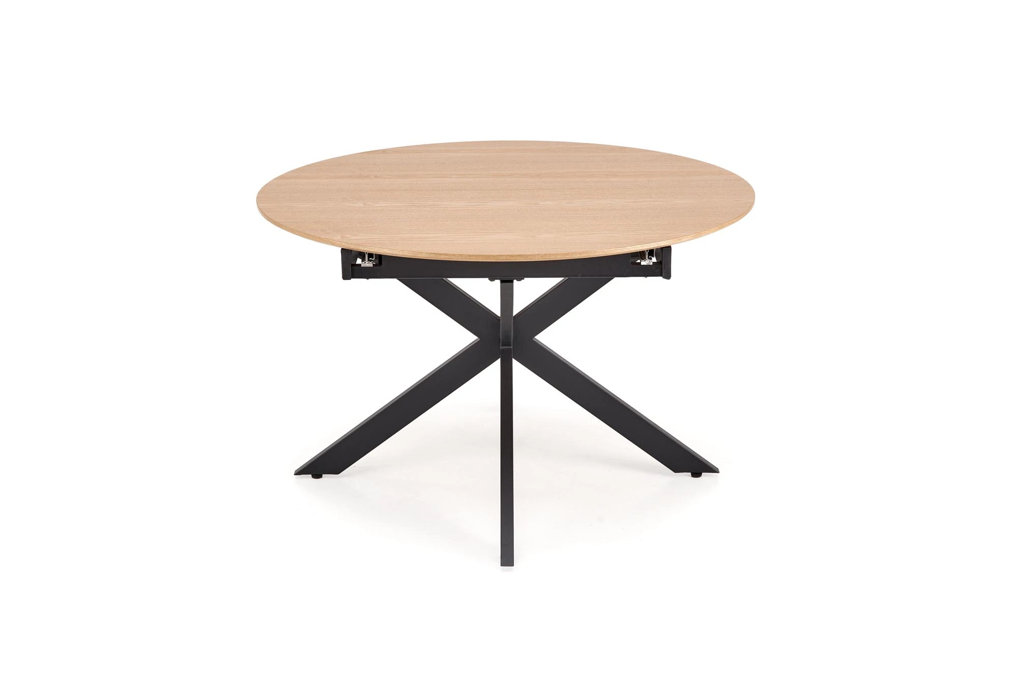 Tento model vyniká kulatou deskou z MDF s přírodní dýhou, která působí sofistikovaně a elegantně. Rozkládací funkce umožňuje rozšíření až na 200 cm, takže bez problému pojme více hostů, když to situace vyžaduje. Práškově lakovaná černá ocelová konstrukce zaručuje pevnost a stabilitu, ale také podtrhuje estetický dojem celého kusu.
