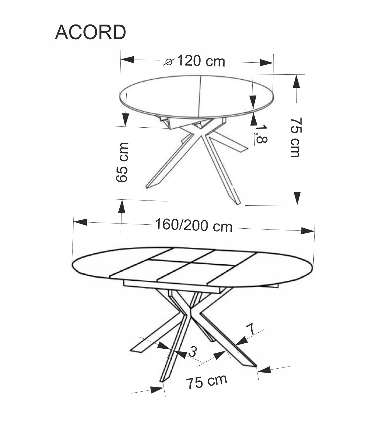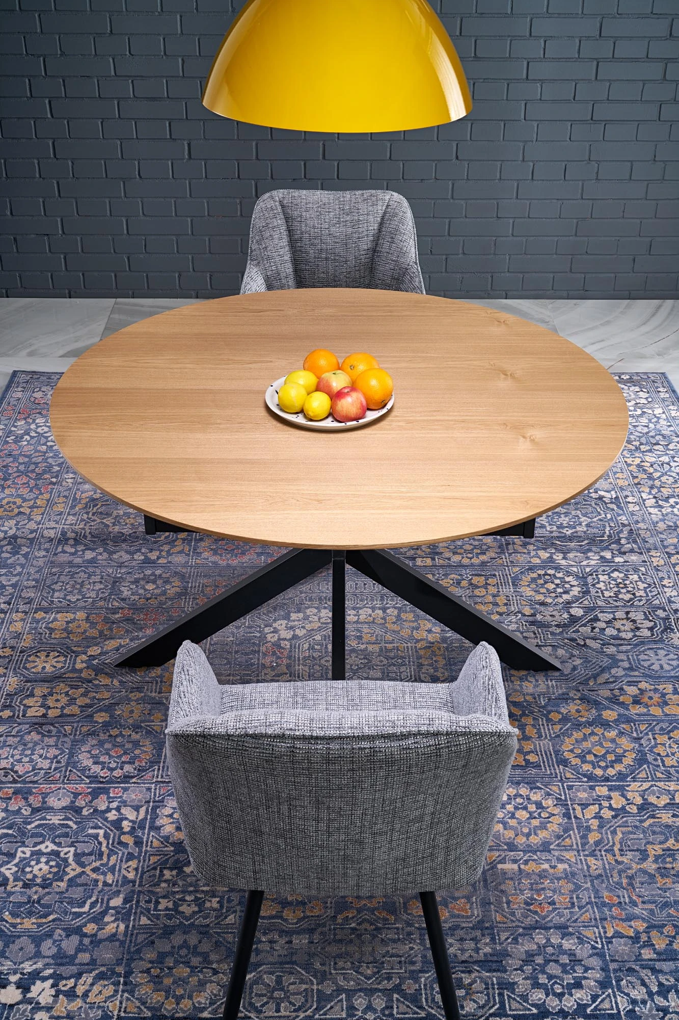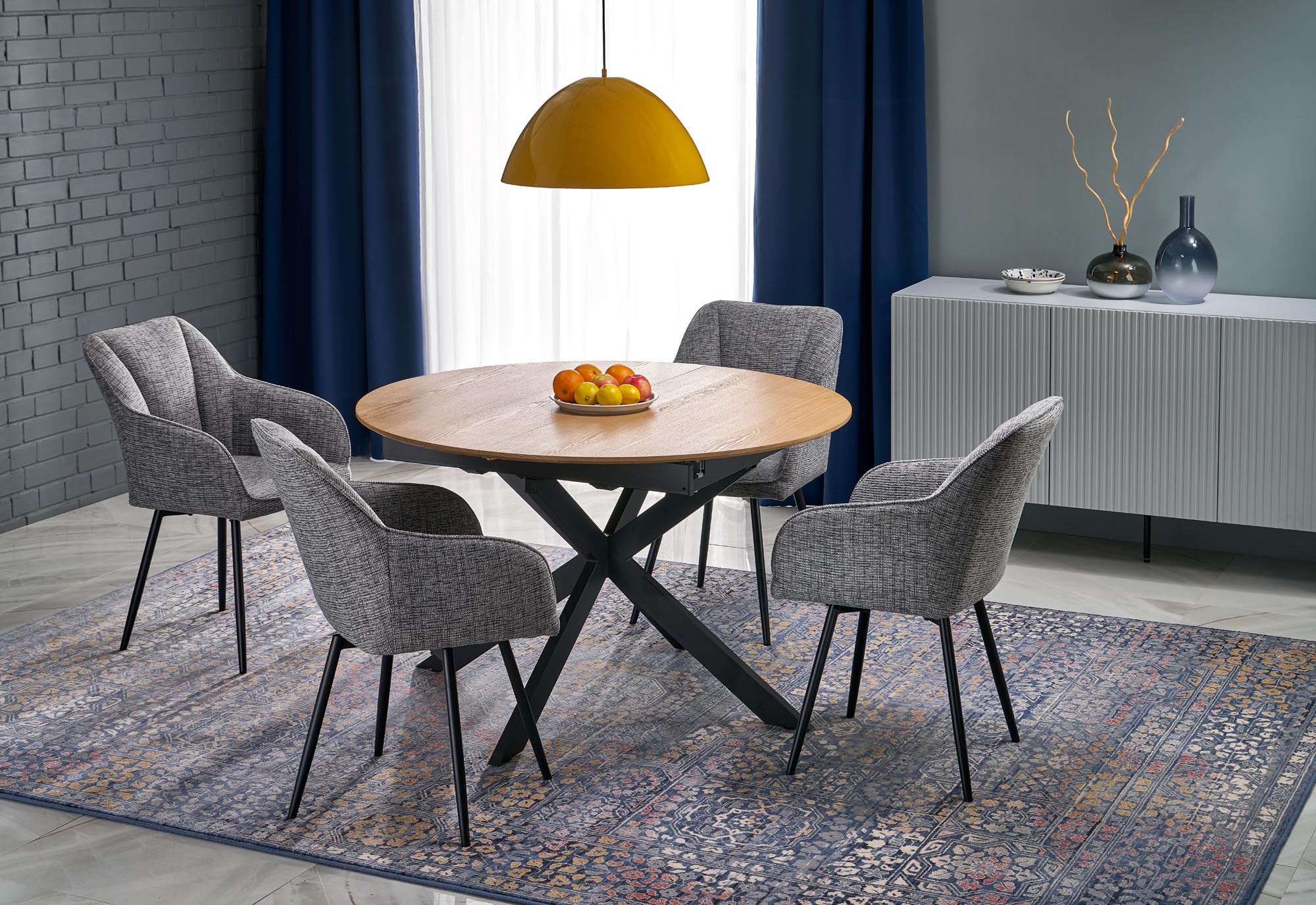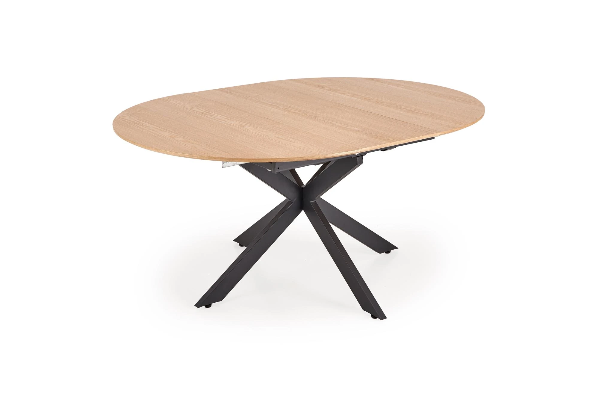 Tento model vyniká kulatou deskou z MDF s přírodní dýhou, která působí sofistikovaně a elegantně. Rozkládací funkce umožňuje rozšíření až na 200 cm, takže bez problému pojme více hostů, když to situace vyžaduje. Práškově lakovaná černá ocelová konstrukce zaručuje pevnost a stabilitu, ale také podtrhuje estetický dojem celého kusu.