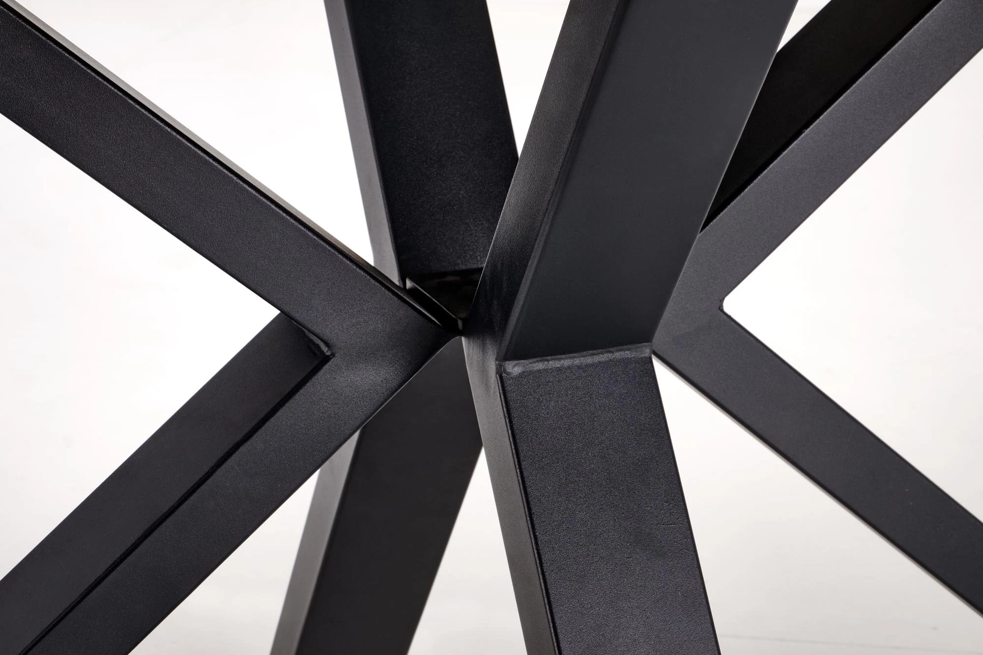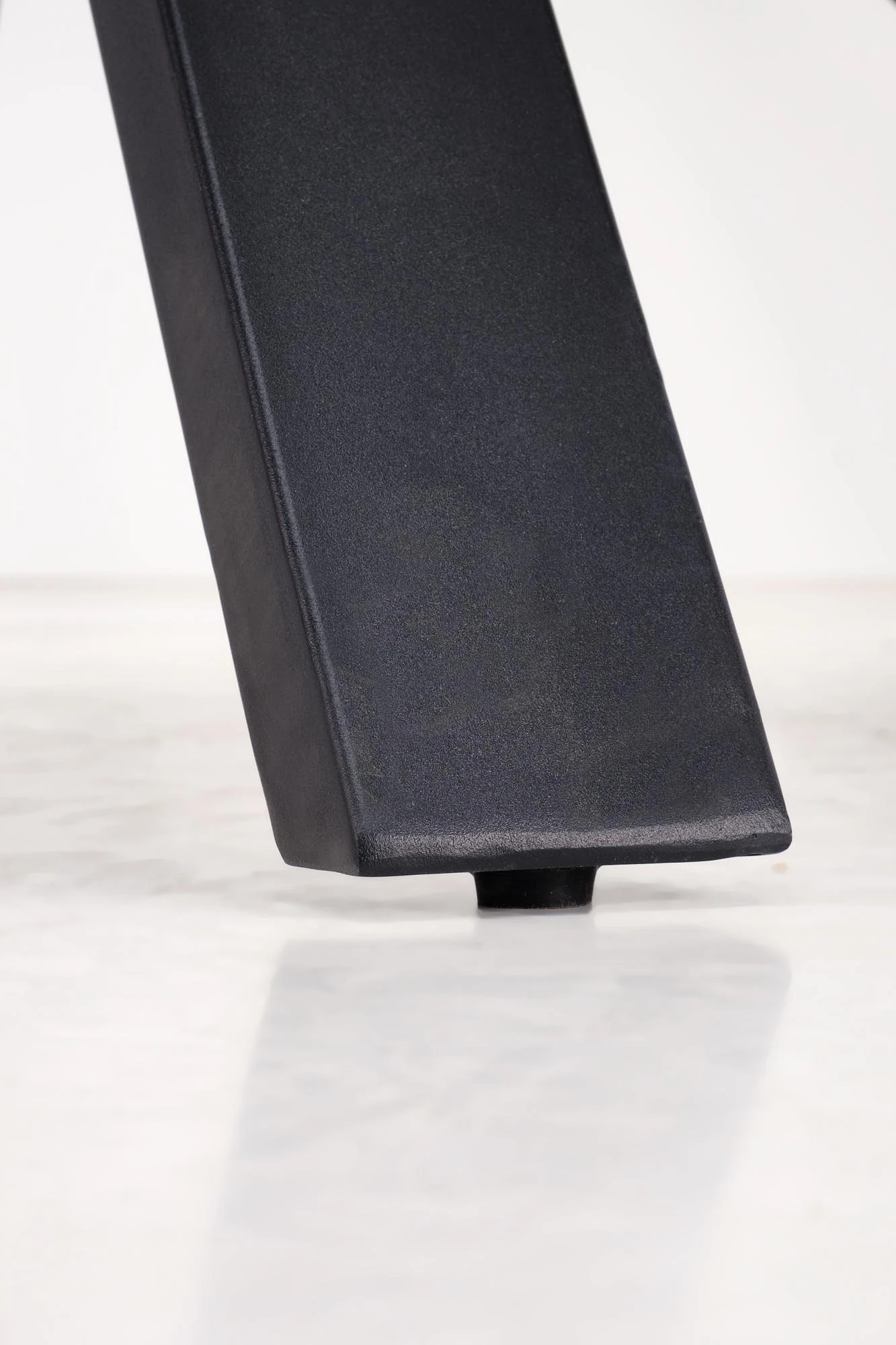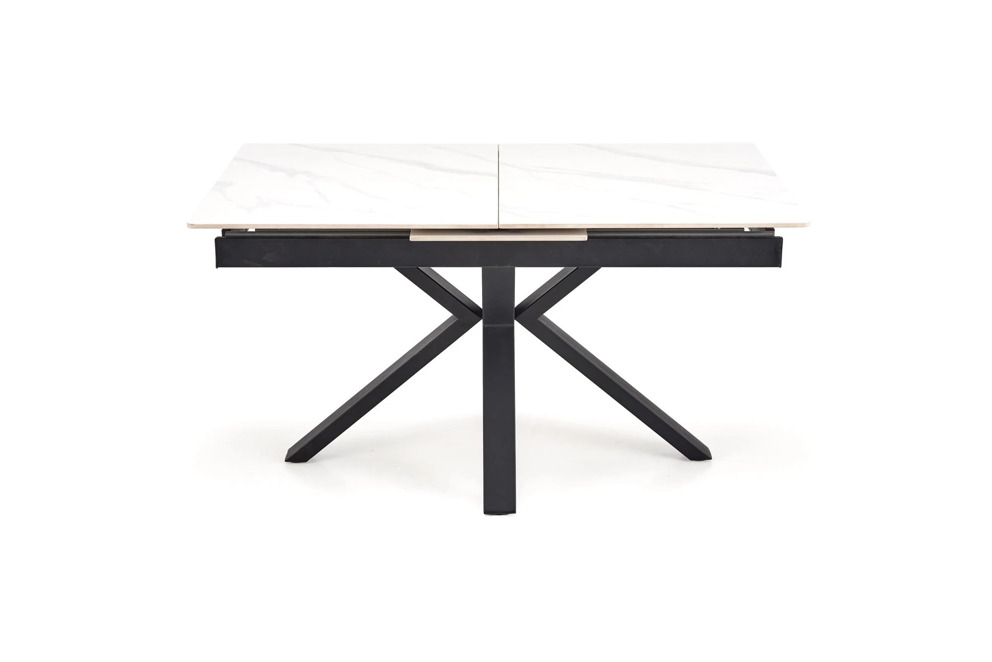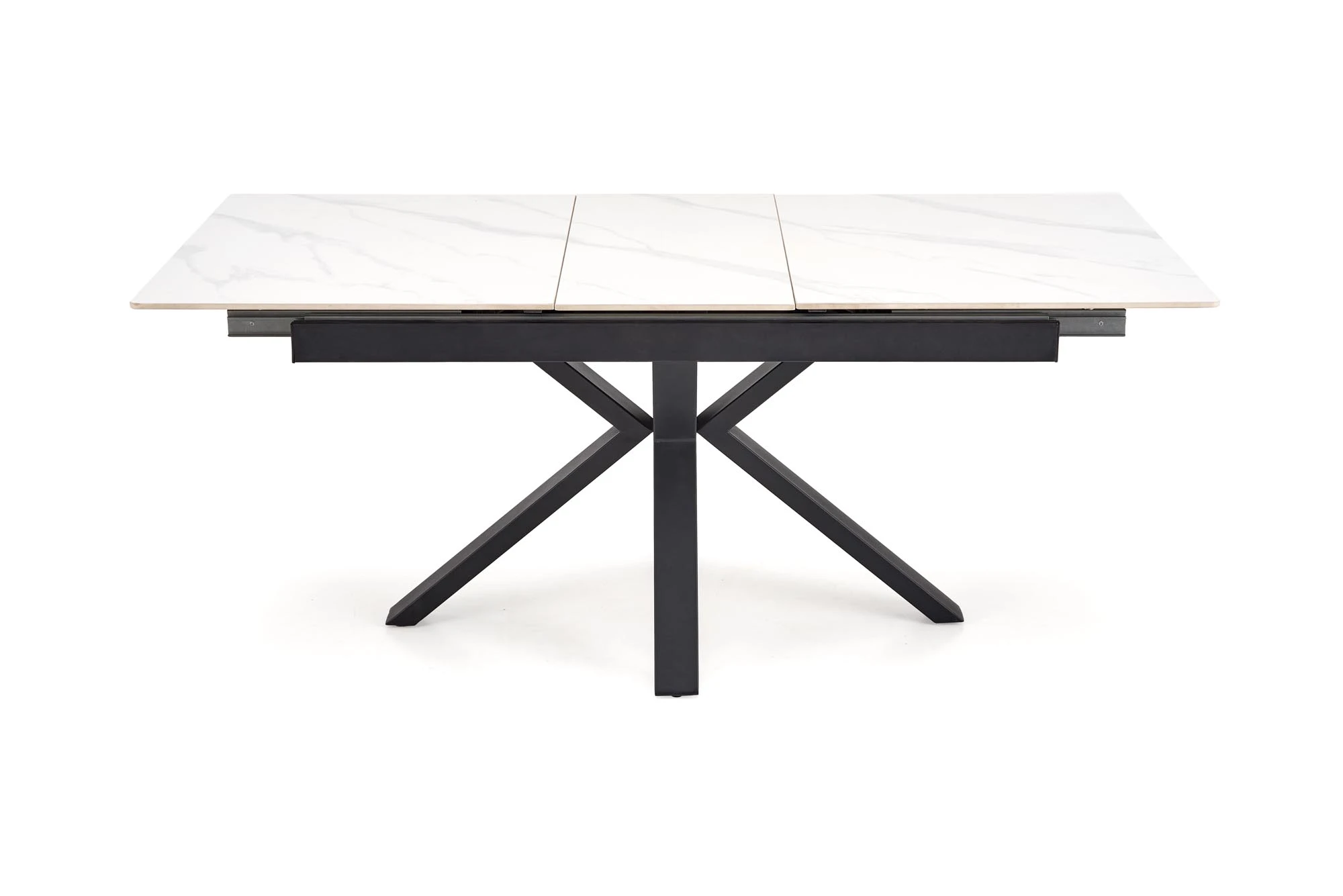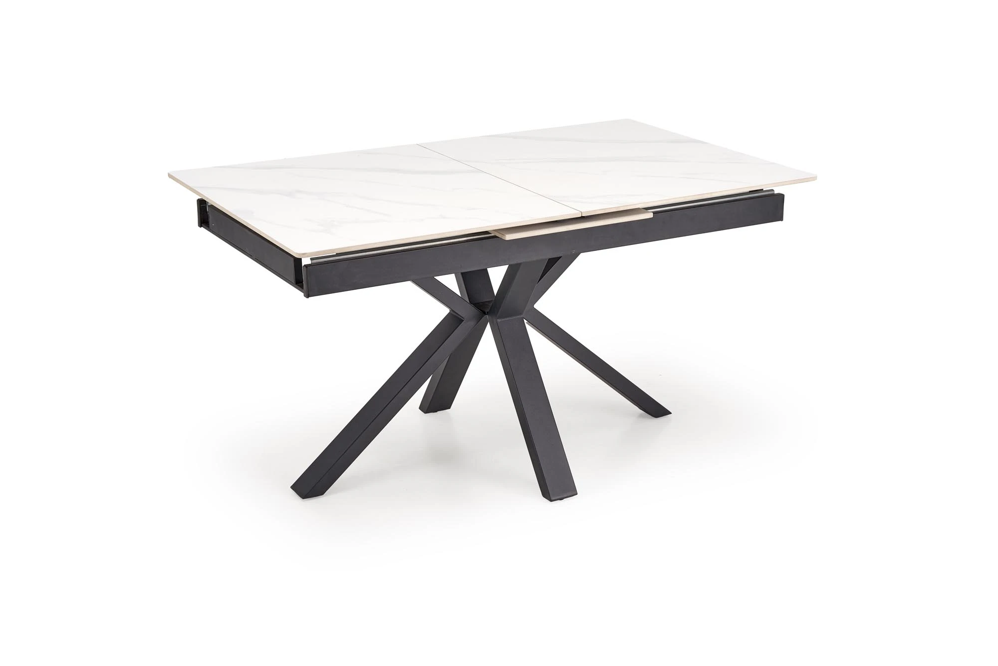 Vrchní deska je vyrobena ze slinutého kamene v odstínu bílého mramoru, který zaujme svou jemnou kresbou a luxusním dojmem. Tento materiál je nejen vizuálně atraktivní, ale také velmi odolný vůči poškrábání, teplotám i běžnému opotřebení. Robustní podnož z černé práškově lakované oceli zajišťuje výbornou stabilitu a dodává celému kusu moderní industriální charakter. Rozkládací funkce umožňuje snadné prodloužení stolu ze 140 na 180 cm, což oceníte při rodinných oslavách i nečekaných návštěvách.