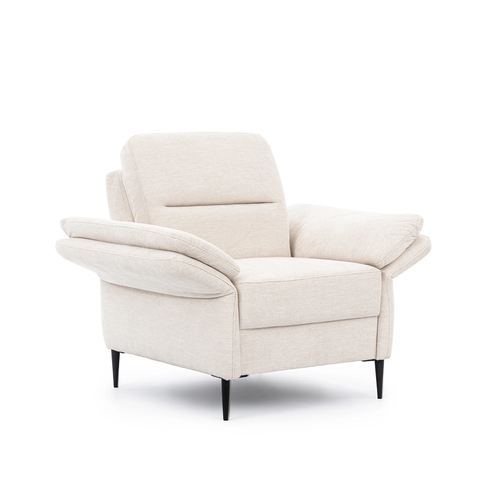 Polohovatelné područky na pohovce i křesle umožňují nastavit ideální pozici podle vaší aktuální potřeby. Kovové nožky (černé, zlaté nebo chromové) zvýrazňují moderní charakter nábytku a usnadňují úklid pod sestavou.