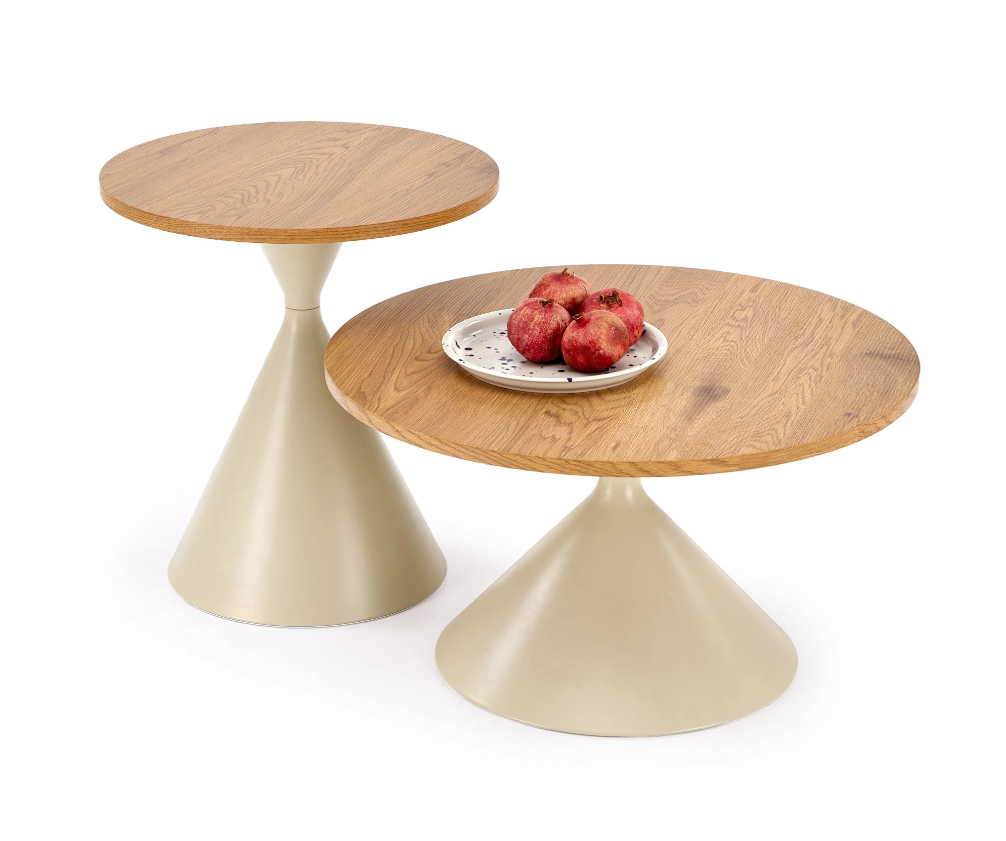 Rozdílné výšky stolků podporují praktické využití – menší stolek lze zasunout pod větší, čímž šetří místo a zároveň vytváří dynamický prvek v interiéru.