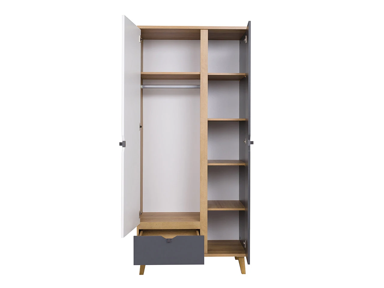 Skříň je vyrobena z laminované dřevotřísky, která zajišťuje pevnost a dlouhou životnost nábytku. Hrany jsou chráněny páskou z ABS, což zvyšuje odolnost proti poškození. Nožky skříně jsou plastové a mají výšku 15 cm, což přispívá k jejímu modernímu vzhledu a stabilitě. Kovové úchyty dodávají skříni elegantní vzhled a usnadňují její otevírání. Skříň je vybavena válečkovými pojezdy pro hladký a tichý chod šuplíků.