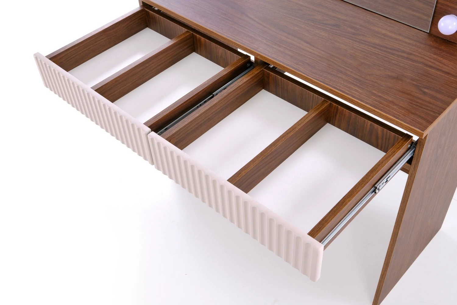 Toaletka disponuje zásuvkami, které umožňují přehledné uložení kosmetiky, šperků i drobných doplňků. Jemné detaily jako frézované (drážkované) fronty podtrhují moderní a elegantní design nábytku.