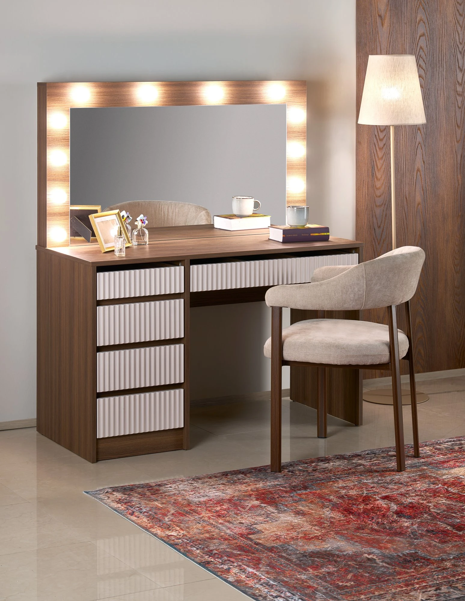 Dominantním prvkem je velké zrcadlo s LED osvětlením, které zajišťuje rovnoměrné nasvícení obličeje a vytváří ideální podmínky pro líčení i péči o pleť. Tento prvek zároveň dodává stolku charakteristický „hollywoodský“ vzhled.