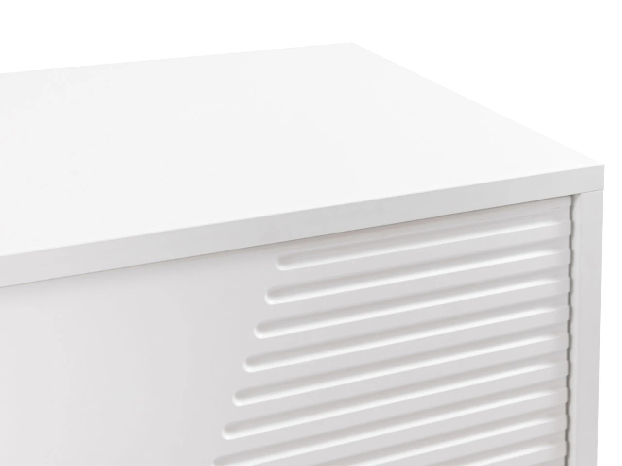 Korpus skříňky je vyroben z laminované dřevotřísky, což zajišťuje vysokou pevnost a odolnost nábytku. Přední část skříňky je tvořena kvalitní MDF deskou, která poskytuje moderní vzhled a dlouhou životnost. Hrany skříňky jsou chráněny PVC páskou o tloušťce 0,6 mm, což přispívá k její trvanlivosti a estetickému vzhledu. Skříňka je vybavena kovovým profilem o výšce 18 cm. Kovové panty jsou vysoce kvalitní a zajišťují dlouhou životnost a hladké otevírání. Pohybové mechanismy jsou zajištěny kuličkovými pojezdy GTV H30 pro plynulé otevírání a zavírání. Tato TV skříňka nemá úchyty, protože otevírání je umožněno pomocí systému 'PUSH TO OPEN', což znamená, že stačí jemně stisknout přední část zásuvky nebo dvířek a skříňka se otevře. Tento inovativní systém zajišťuje pohodlné a bezproblémové používání bez potřeby klasických úchytů.